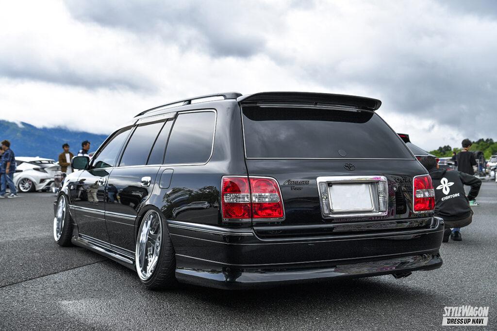 現行モデルで久々に復活したクラウンエステート。しかしエステートと聞くと、17クラウンのステーションワゴンモデルを思い浮かべる人も多いのではないだろうか。ゆーたさんはスノボに行くため、4WDのエステートを購入した。しかし車高はベタベタにしたく、ACCのエアサスを導入。さらにフロントのワンオフナックルやリアアッパーアームを組み込み、キャンバーも効かせる。パッと見で4WDと思った人は少ないのではないだろうか。純正オプションのエアロで下まわりにボリュームを与え、車高の低さをさらに際立たせる。