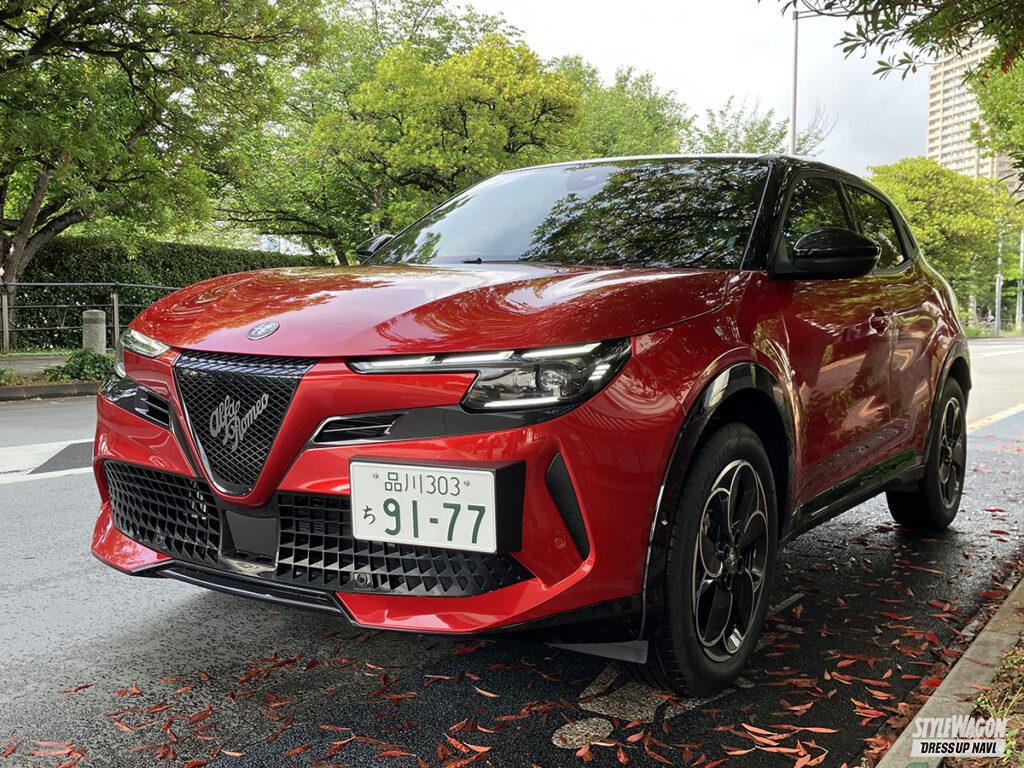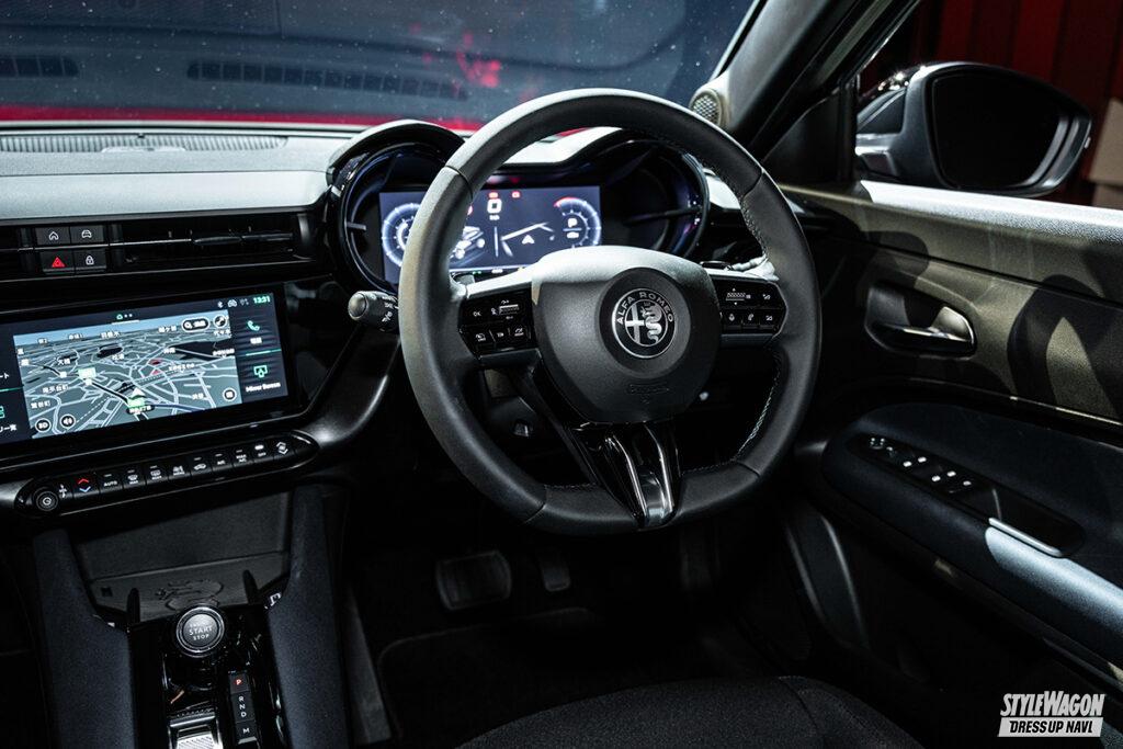 外観は、同じプラットフォームを使っているとは思えないほどアルファらしいこだわりが詰まっている。顔つきで目を惹くのは、「トライローブ」と呼ぶ三つ葉形状のフロントグリルで、同ブランドの伝統を踏襲。一方で新鮮味にあふれているのが「コ」の字型の3眼ヘッドライトまわりで、ヘッドライト下側のガーニッシュもグリルに向かって大きな「コ」の字を描く。グリルは2タイプあり、導入限定車の「スペチアーレ」とEVの「エレットリカ」は、同ブランドの象徴である「スクデット(盾グリル)」を切り抜いた「プログレッソ」と呼ぶ意匠になる。マイルドハイブリッドの「イブリダ コア」と「イブリダ プレミアム」は、グリル内にアルファロメオのブランドロゴを配した「レジェンダ」になる。足元に5ホールデザインのアルミホイールを設定したり、リアウインドウと一体化したドアハンドルを採用するなど、細部へのこだわりもアルファらしさに満ちている。