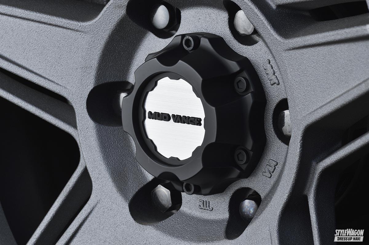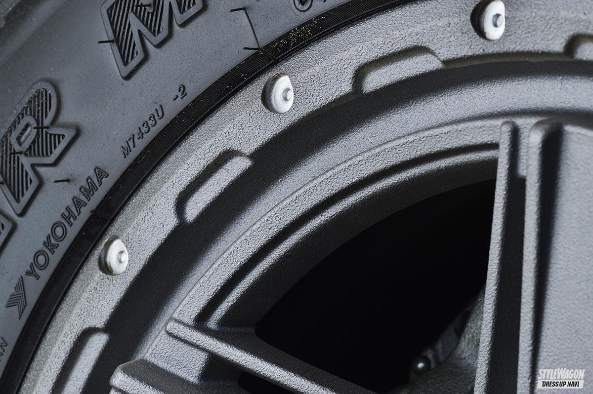 リムフランジには台形のディンプルとドリルドピアスが連なっており、アウトドア系らしいビードロックリング風に仕上げられているのもポイント。センターパートがガツンと落とし込まれていたり、突出したセンターキャップがギアっぽい意匠だったりと、アウトドア仕様にジャストなギミックも随所に採用されている。