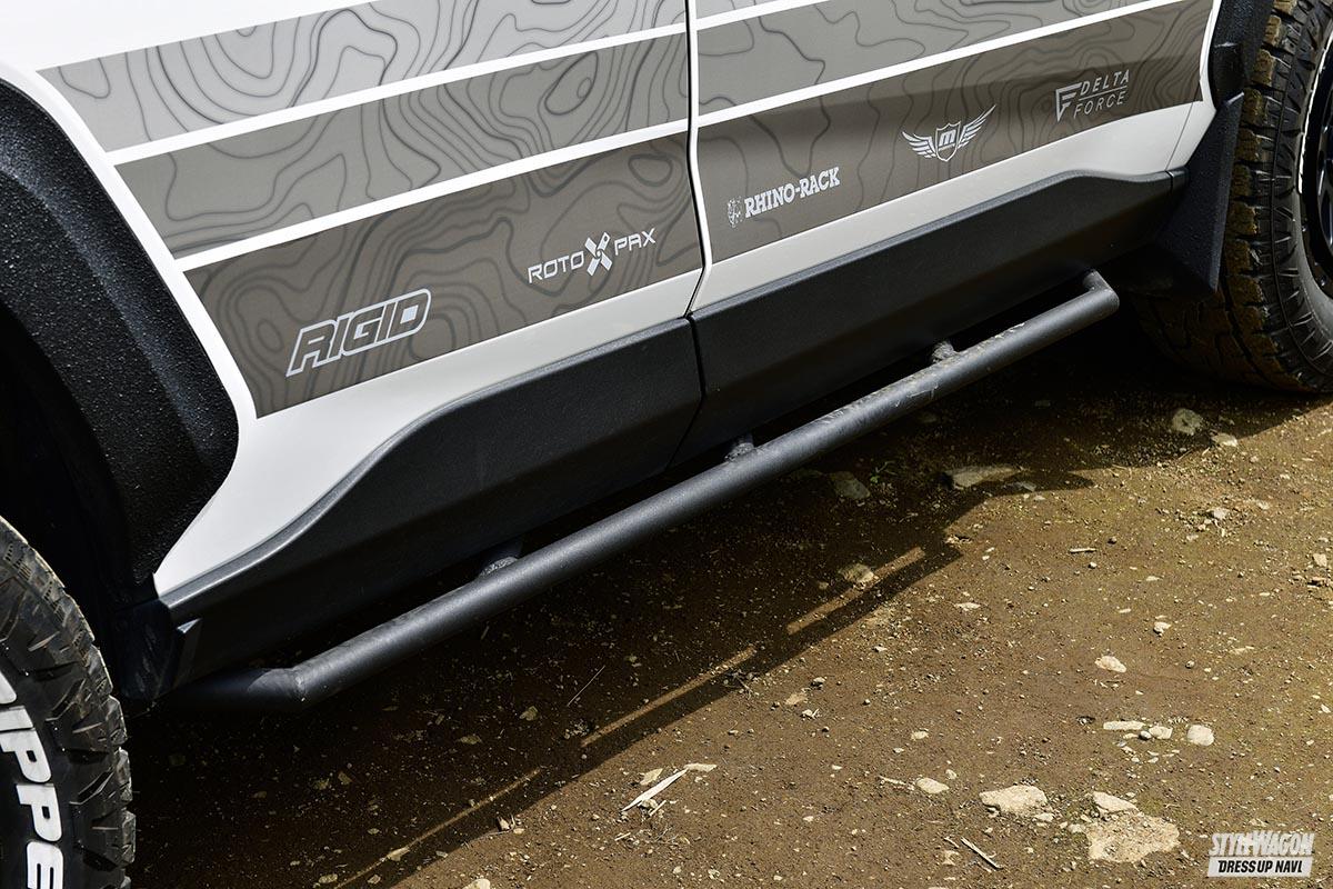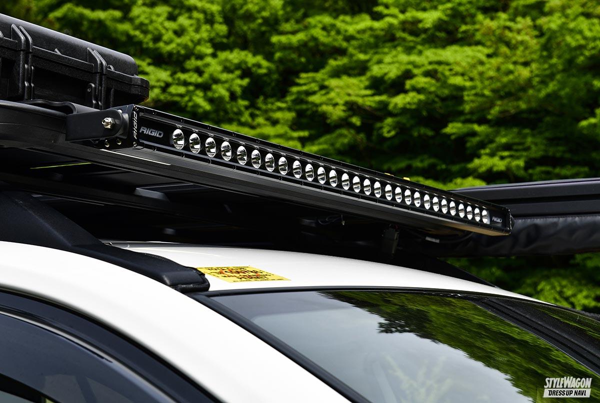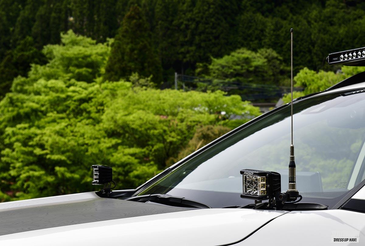 タコマ風グリルやライノラックのルーフラック&オーニング、リジッドインダストリーのLEDバーなど、USテイストもプラス。カラーはモノトーンでまとめるが、少しだけ黄色のアクセントを入れて個性を演出する。