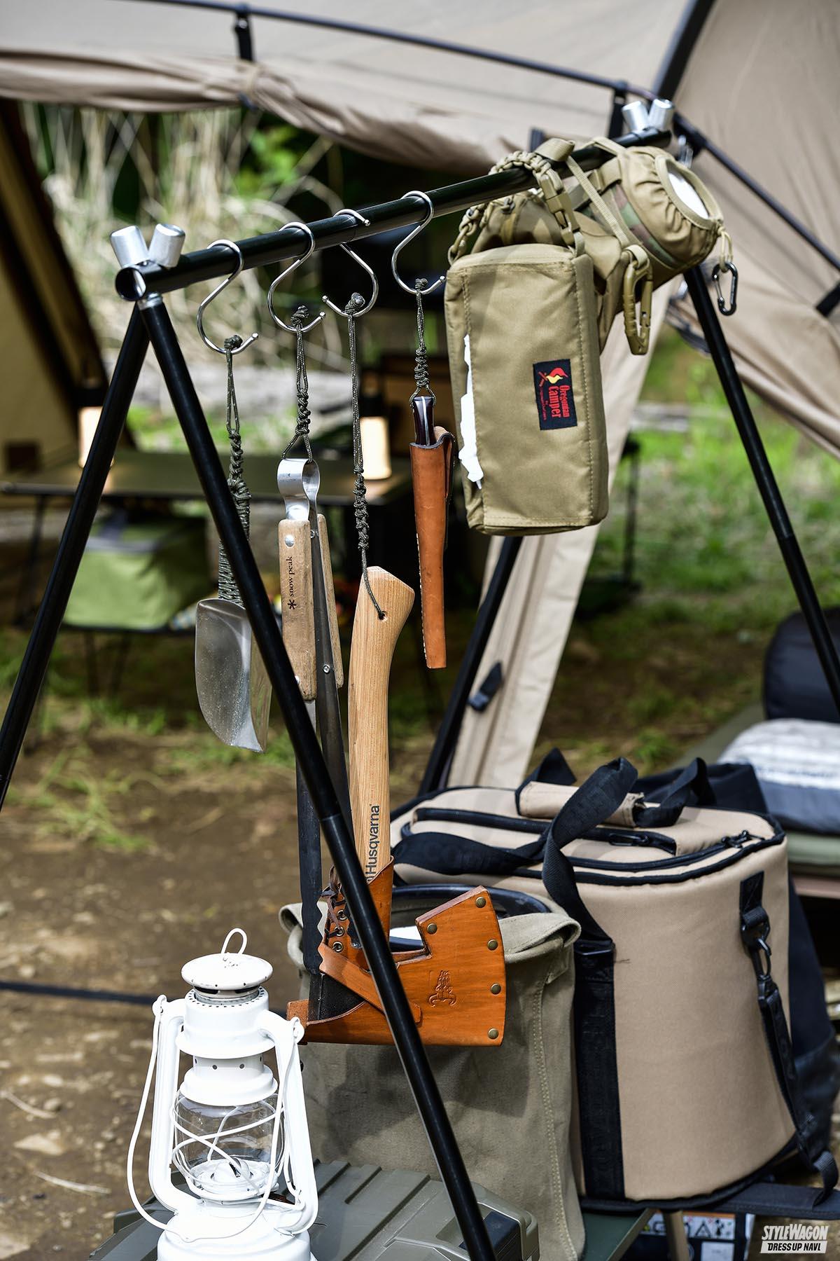 4人+1匹のファミリーは、オーナーを除くとみんな女性。もちろんそれはそれで幸せだし、肩身が狭いわけでもないのだが、たまには息抜きしてきたら? と奥様の許可を得てアウトドアのプライベートタイムへ。ほんのひと時を快適に過ごすべく、丁寧に設営していく過程もまた楽しい。ボーイスカウト時代に習得したロープワークも冴え渡り、今日もくつろぐ準備は万端だ。
