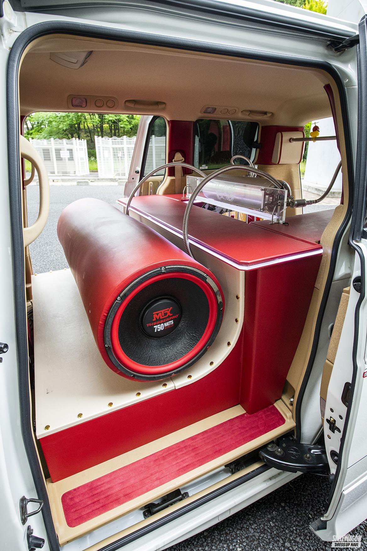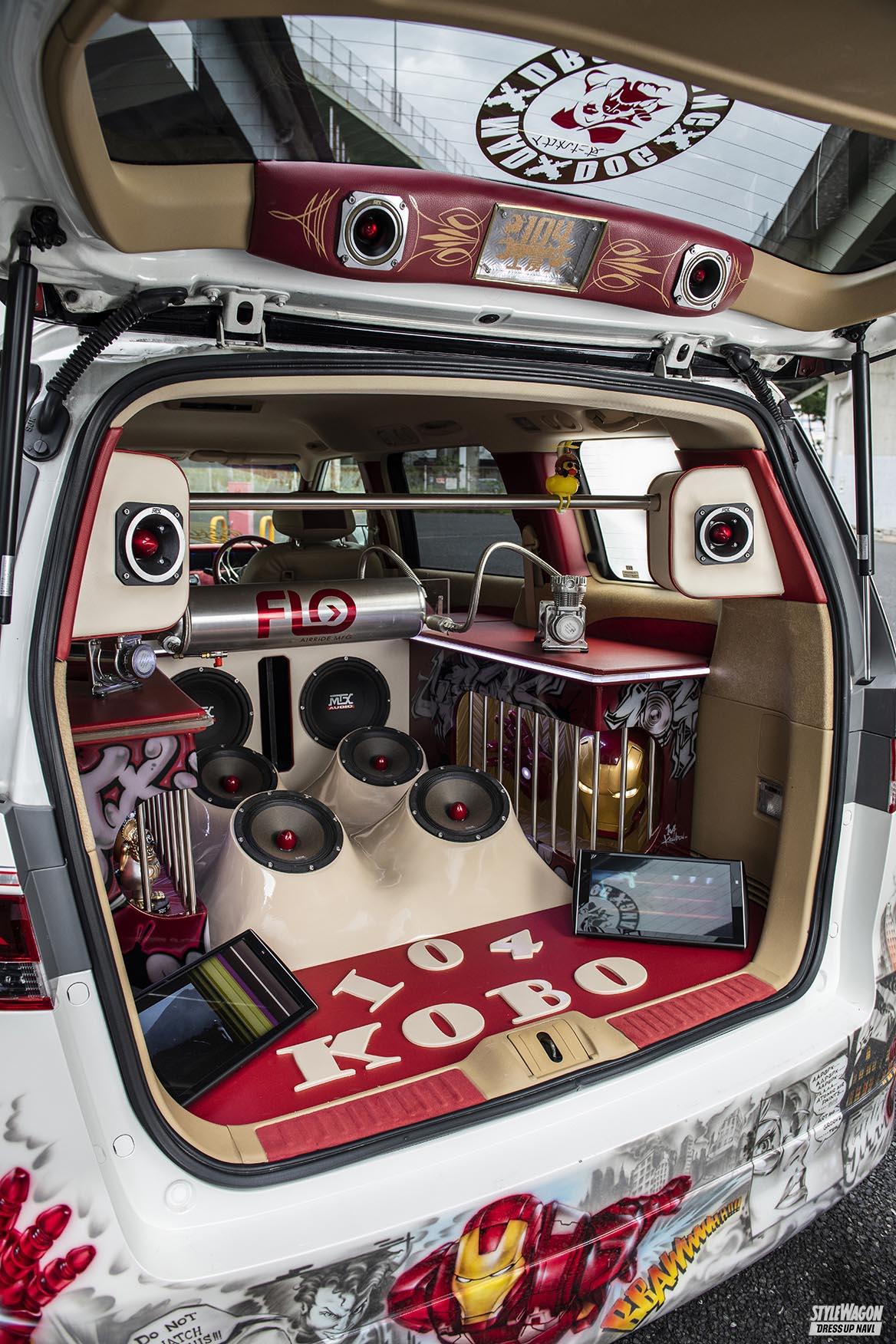 個性的なバンパーにアイアンマンのエアブラシやピンスト、カラフルなスピナーホイールなどで、ポップなUS仕様に仕上げられたエリシオン。他人と被るのがイヤで選んだエリシオンだが、とにかくパーツが少なくポン付けカスタムは無理。そこでワンオフやDIYを多用して対処。アイキャッチポイントの多いエクステリアに目が引き付けられがちだが、張り替えやカスタムオーディオがインストールされたインテリアも超ハイレベルな仕上がり。しかも内装張り替えから、オーディオのボックス製作、インストールまですべて自分で仕上げたDIYというから驚き。