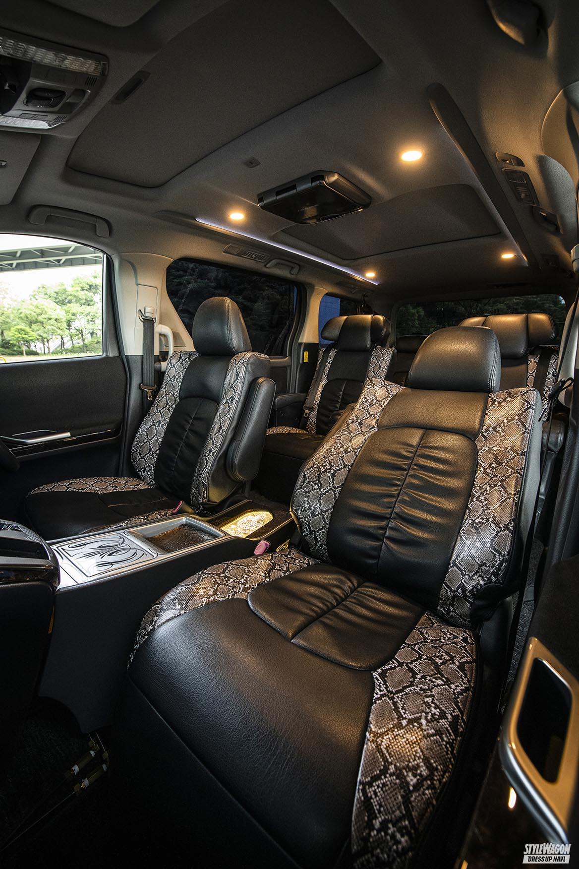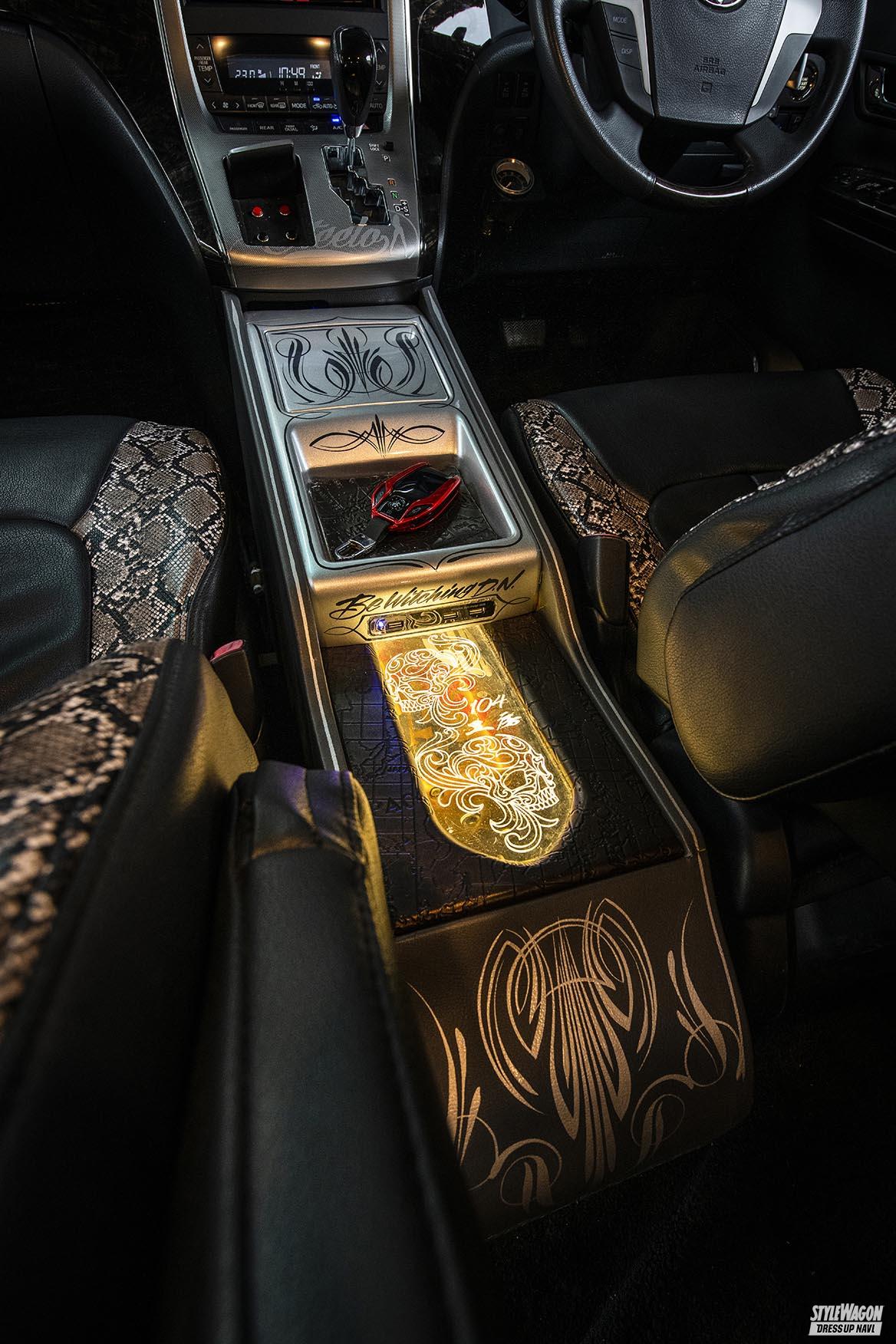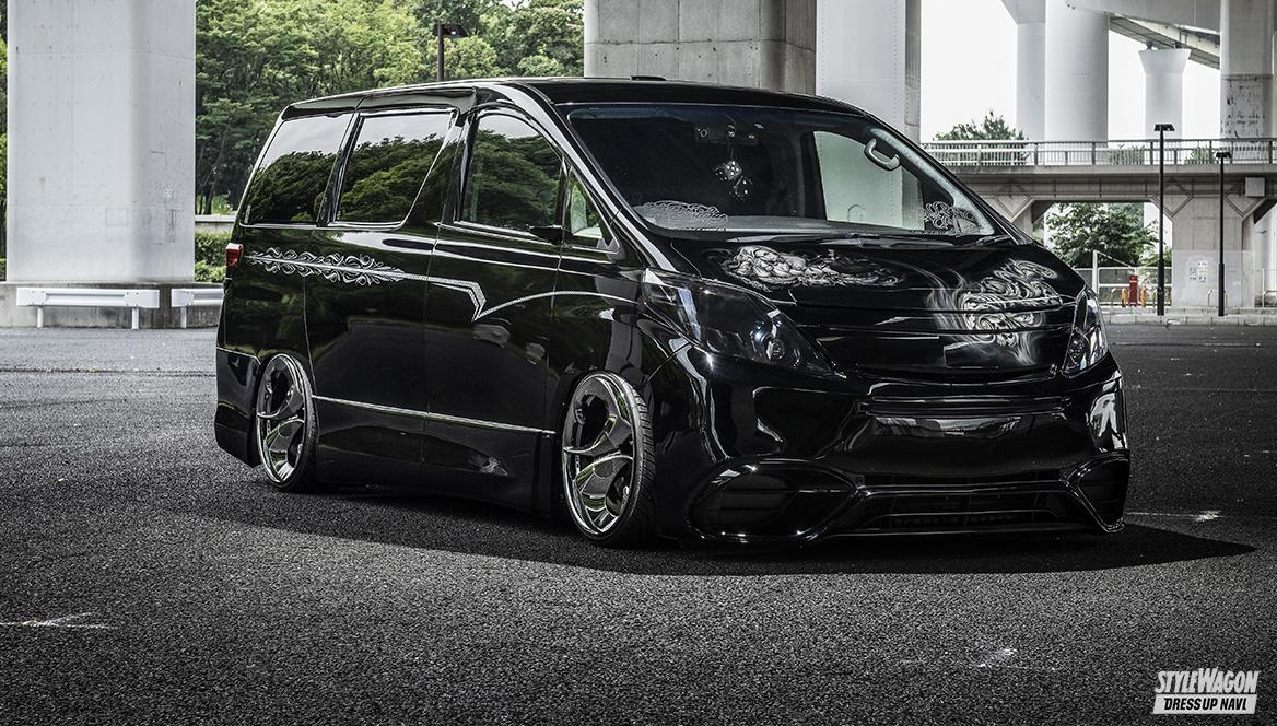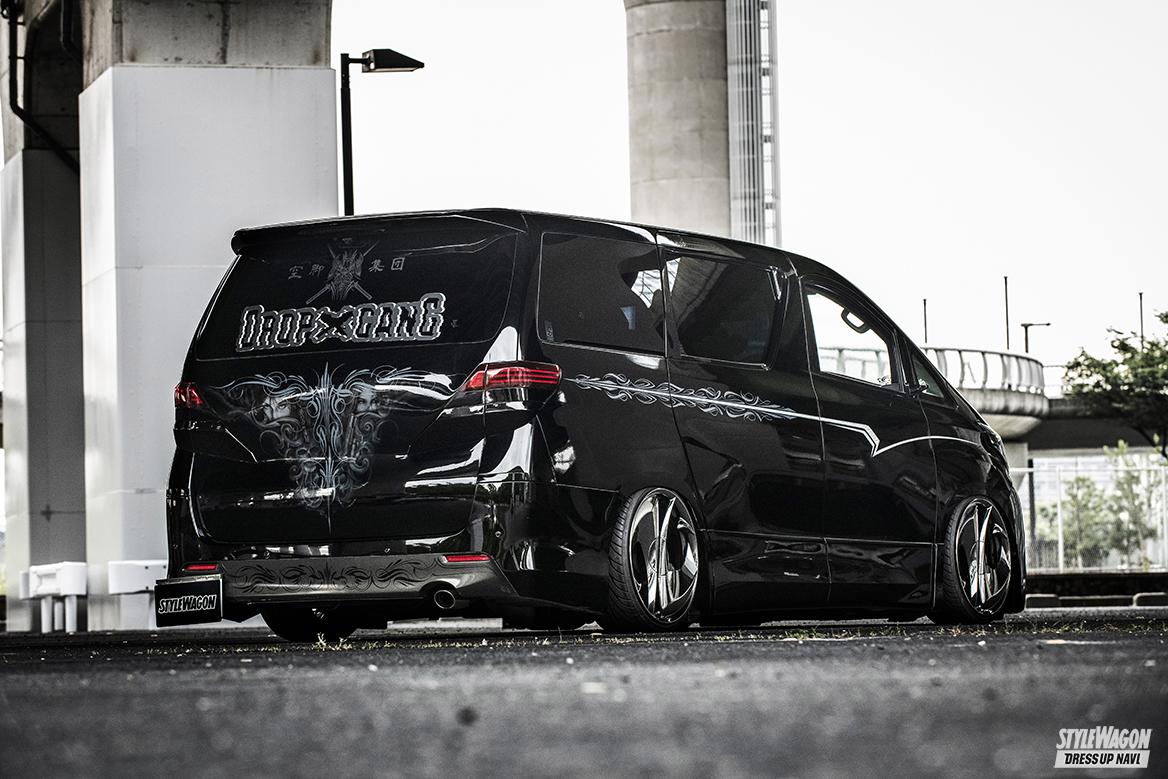 ホイールとエアブラシ、テールレンズ以外は、オールブラックで妖しさ満載のアルファード。「イベントとかでカッコいいと言われるより『気持ち悪い』と言われる方がウレシイ」というのが伸一さん。全体の妖しさを増長しているのが、ドアハンドルすべて(左右&後)のスムージングとドアミラーレス仕様。ドアミラー位置にはカメラをセットし、左右の映像はメーターパネル内のモニターに映し出す仕組み。こんな外装だが、基本的にはファミリーカーなので、内装はカスタムしているが、ラゲッジも乗車スペースもすべて普通に使えるのもポイントだ。