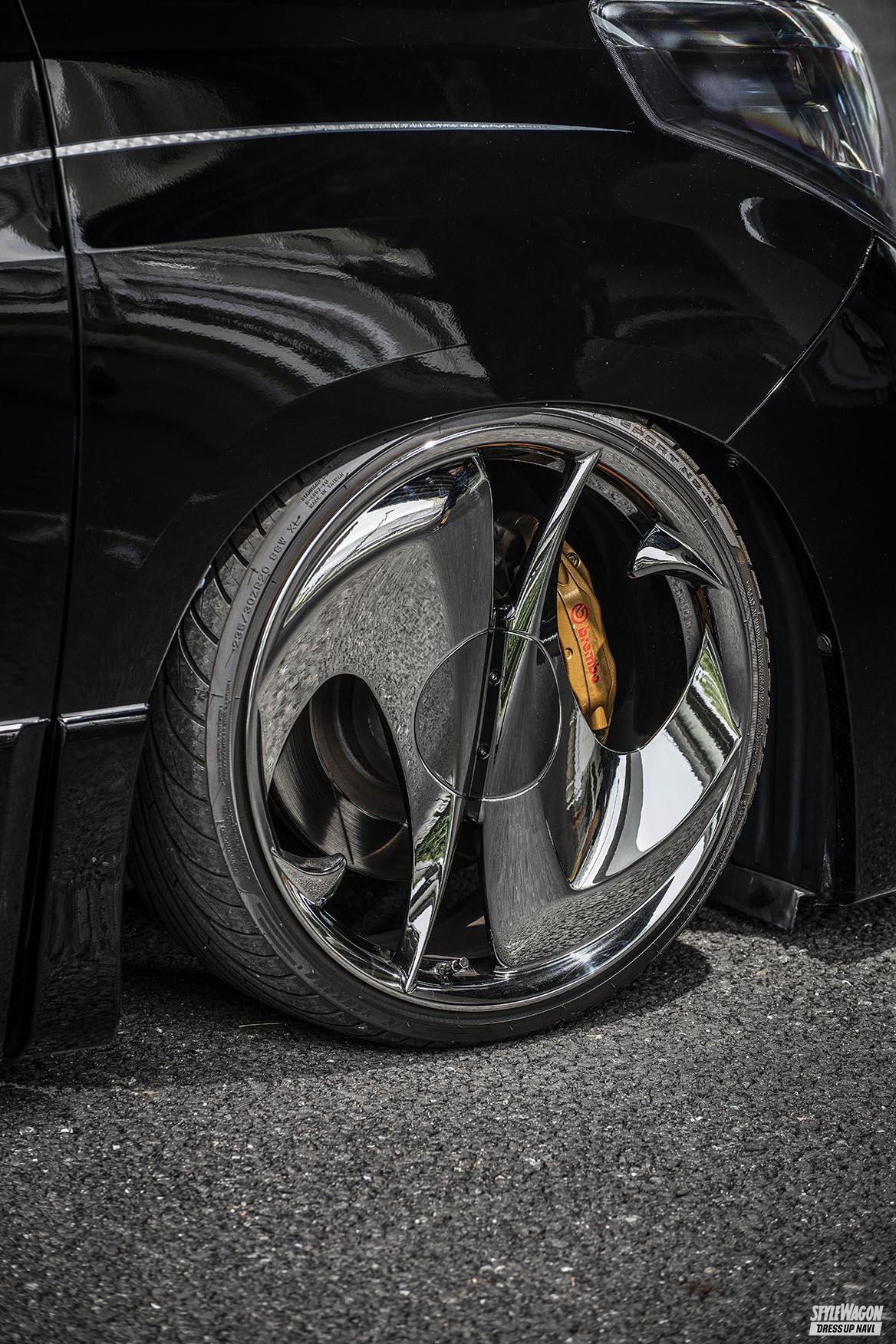 エリシオンは「他人と被りにくい車種」という理由で選んだが、パーツが少ないというネックがあり、カスタムはワンオフがほとんど。個性的なフロントバンパーは、純正の下半分にBMW4シリーズ(F33)の開口部をドッキング。カラフルなスピナーホイールやピンスト&アメコミエアブラシでUSテイストをアピールしている。片や伸一さんのアルファードは、ドアハンドルもドアミラーもないフルスムージングのブラックボディに、メッキホイール、ピンスト&エアブラシを投入。カラッと明るい西海岸的雰囲気のエリシオンに対して、妖しさ炸裂、アウトローな雰囲気を漂わせる仕上がりが対照的な2台。お互いが刺激し合いながら独自のカスタムを魅せるハラグチブラザースなのだ。