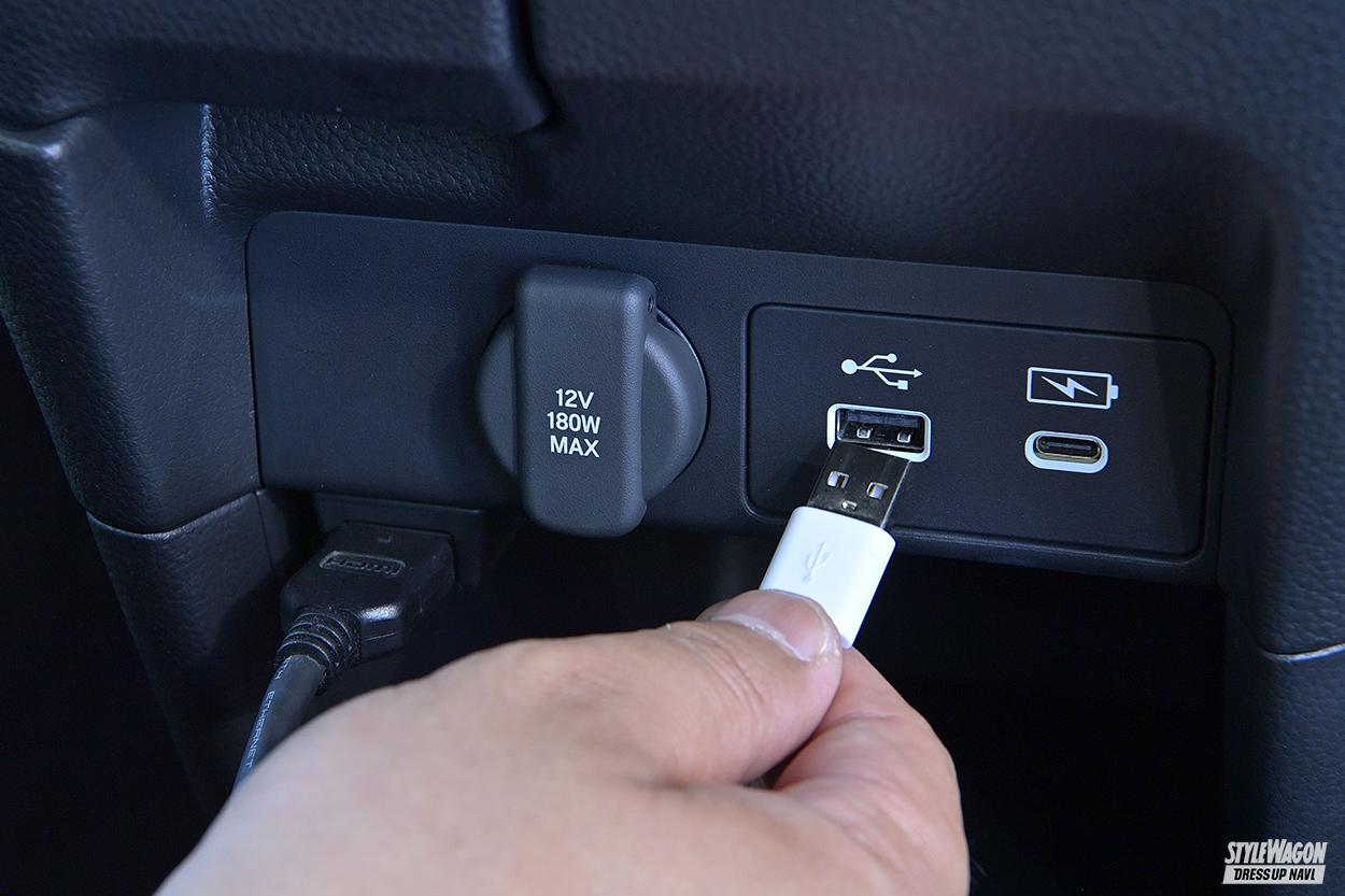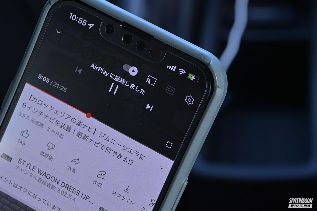 撮影車には、純正ナビとリア席モニターが装着されており、インパネ下部には、HDMI端子、USB端子、シガープラグを装備。追加で用意したのは、iPhoneiとHDMIケーブル、ライトニングケーブル、iPhoneとHDMIケーブルを繋ぐアップル純正のアダプタの4つだ。これだけ用意すればWi-Fiルーターと共に簡単に純正ナビ画面で映像メディアを楽しめた。リア席モニターだけに映像を映し、ナビ画面は地図表示とするファミリーでのドライブを想定した使い方も可能。最近は社外ナビへと交換しずらいクルマも増えている。カーAVブランドとの新たな関わり合いとしても注目だ。