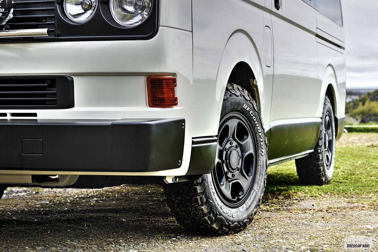 ホイールに関してはオフ系モデルも増えてきており、好みに合わせた選択ができる状況になっているから心配なし。レンコン系などいわゆる王道のオフロード向けデザインを選べば雰囲気はアガってくるし、ワイルドでアグレッシブなUSミリタリー系、スパルタン系などもオフスタイルにはよく似合う意匠だ。