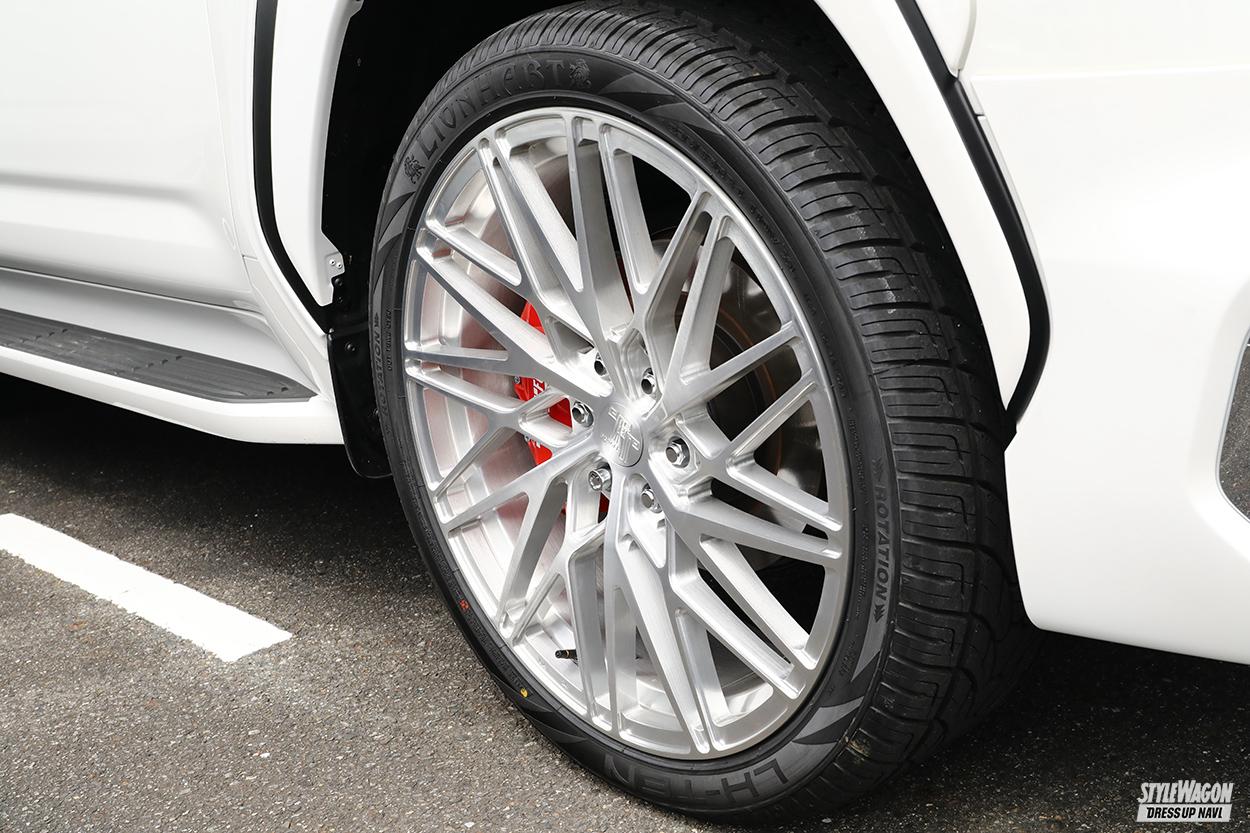 ZXのモデリスタ仕様にT&Tフォージドの24インチ鍛造1ピース&ライオンハートのオンロードタイヤ(295/35R24)を合わせたオンロード仕様。「24インチにインチアップしたら、ホイールが軽いからか、タイヤがいいのか燃費が良くなった」と驚くしもしもさん。キャンプによく出かけるだけに、今後はACCイージーアップでリフトアップを予定。