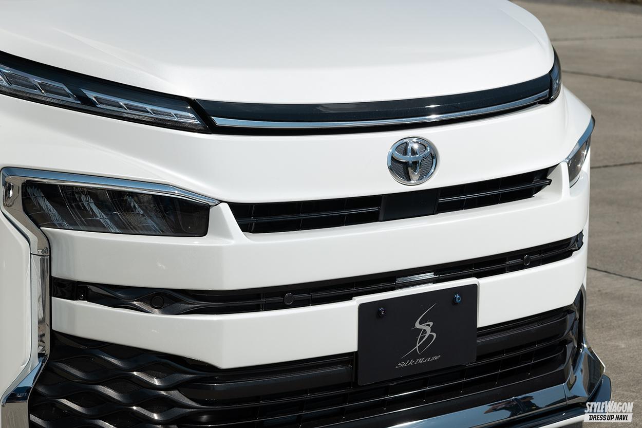 90系ノア&ヴォクシーに向け、多彩なアイテムを展開するシルクブレイズから、待望のエアロパーツが登場。まずは、クルマのイメージを大きく左右するフロントのアイテムが先行リリースされた。バンパー底に追加するリップスポイラーは、サイドをカナード風に仕上げるなど、スポーティなデザインを採用。抑揚を効かせたラインや適度な厚みを持たせることで、薄型ながらも存在感は高く、変わった感をしっかりと味わえる。さらに、特徴的なフェイスを激変させるグリルカバーも設定。どことなくのっぺりとした顔つきを、洗練した印象に仕上げてくれる逸品だ。