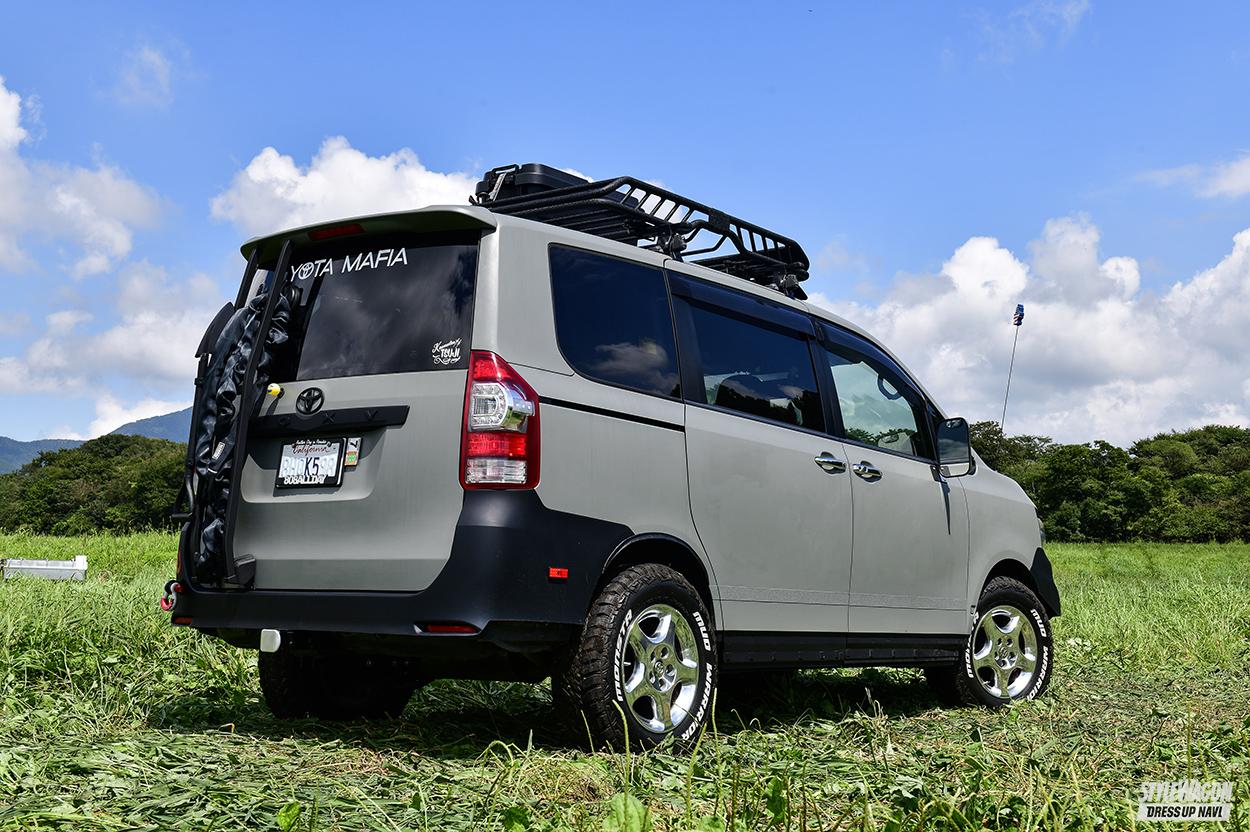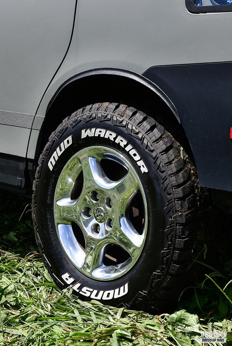 SPEC●ホイール:アリスト純正(16×7.5J+50)●タイヤ:モンスタタイヤ・マッドウォーリア(235/70)●エクステリア:F&R=純正バンパーカット、ベースキャリア=イノー、ルーフラック=ツールスアイランド、USバン用ミラー●サスペンション:Fスプリング=80ノア純正、Rスプリング=30エスティマ純正、F自作スペーサー、Rアジャスター=イデアル