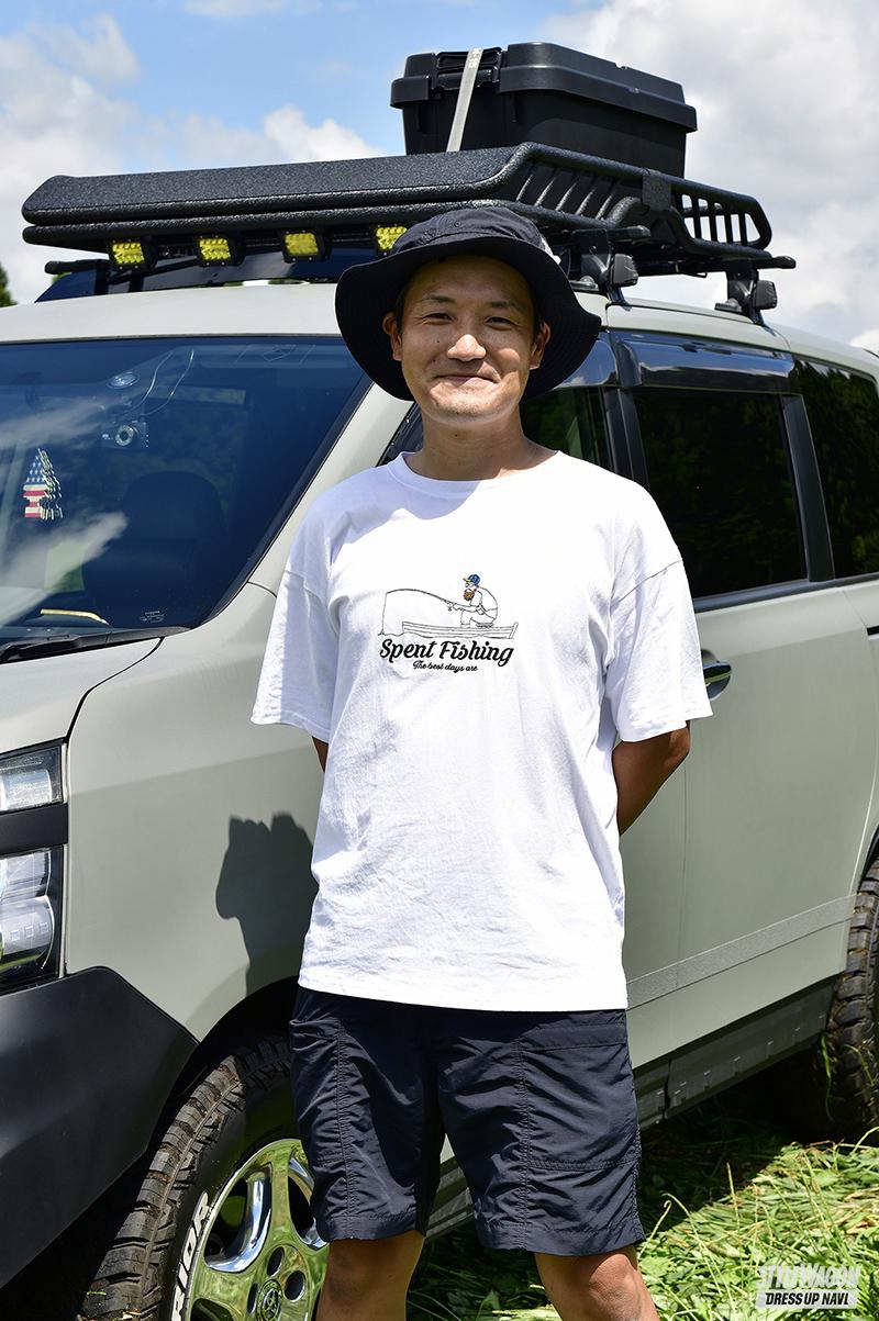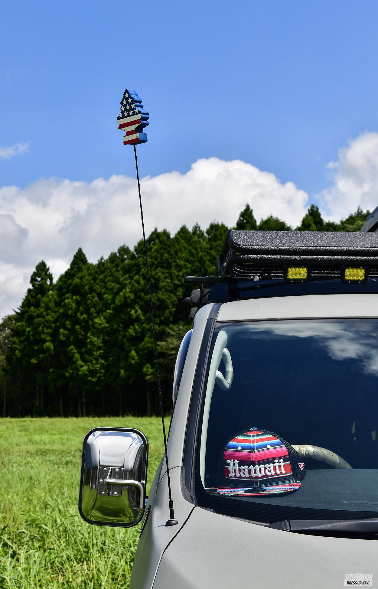 昨年5月にルーフがやれたのでDIYでオールペイントしたのをきっかけにこちらの世界へとやってきた小川さん。「黒バンパーとグレーで検索してたらアゲバンを見つけて、3ヶ月後に純正バンパーをカットしてました。マッドテレーン入れたら邪魔だし、周りがみんな切り出したので(笑)」という。フロントのガードバーは「塩ビパイプをDIYで曲げて作りました」。
