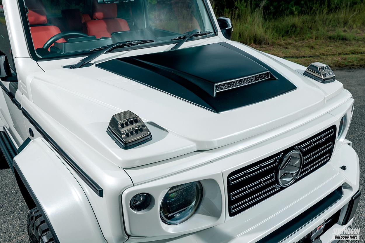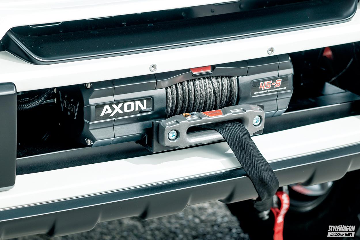 ローダウン&オンロードスタイルのマッドロンGTをベースに、人気のアゲ&オフタイヤというクロススタイルに仕上げたのがマッドロンGT-X。前後バンパーにワイドフェンダー、サイドステップ、ボンネットなどはGTと共通。ただしフロントバンパー両サイドのエクステンションは、大径オフタイヤに対応するようにGT用よりも細く仕上げられていたり、センターダクト左右には縦位置のカバーが付くなどGT-X専用のアイテムも導入。グリルは横ルーバーのタイプ2(エンブレムは別売り)。車高を3インチアップしオリジナルのA・LAP-J07X&オフタイヤでスキのないクロススタイルを完成させている。