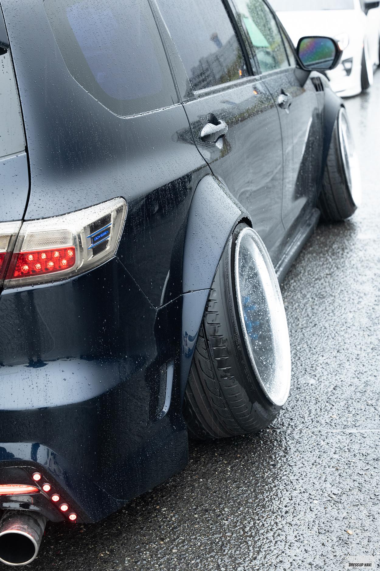 あらゆるスタイルに映えるスポーティデザインに惚れ込んでワークエモーションCR2PをRB3オデッセイにマッチングするShunちゃんさんは、これまでノーマルフェンダーで履きこなしていた足もとへ圧巻の深みを加えるべくワイド化に着手! フロント片側100㎜、リア片側150㎜ものワンオフフェンダーを作り上げて、フロントは9.5Jから10.5J、リアは10.5Jから12Jへサイズ変更している。もちろん、大のお気に入りである2×5のディスクデザインはそのままだが、暴力的ともいえるフェンダーボリュームとリムの深みによって、足もとのイメージは激変。お気に入りのワークエモーションCR2Pに、圧巻インパクト放つ新境地を切り開いた。