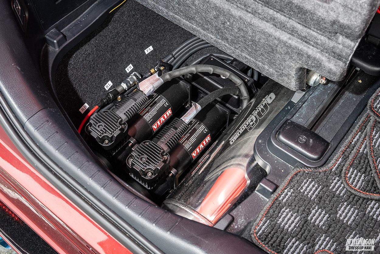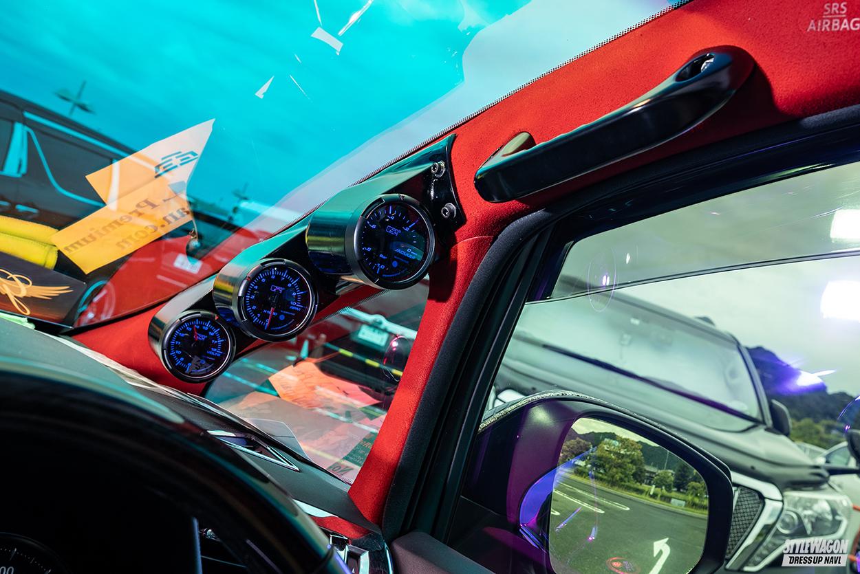 ベースはKUHLのコンプリートモデルでありながら、プロの匠技とDIYによってたゆまぬ進化を重ねてきた、完成度も製作費も超ド級のアルファード。とにかく足まわりには注力されているそうで、スイングアームの下げ止めカットや位置上げなどを駆使することで乗り心地向上を実現している。また、フロントフェンダーには内部に鉄板を張り合わせることで、ノーマル形状を保ったまま強度UPを実現。低車高のまま走行する際、タイヤが擦れてしまってもフェンダーが波打たないよう考慮されている。こんな目に見えない丁寧なカスタムを積み重ねることで、ドレスアップのクオリティUPと同時に製作費の爆アゲを実現しているのであります。ちなみに車両に常備しているアイテムは油圧ジャッキだそうです(笑)。
