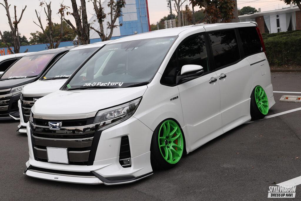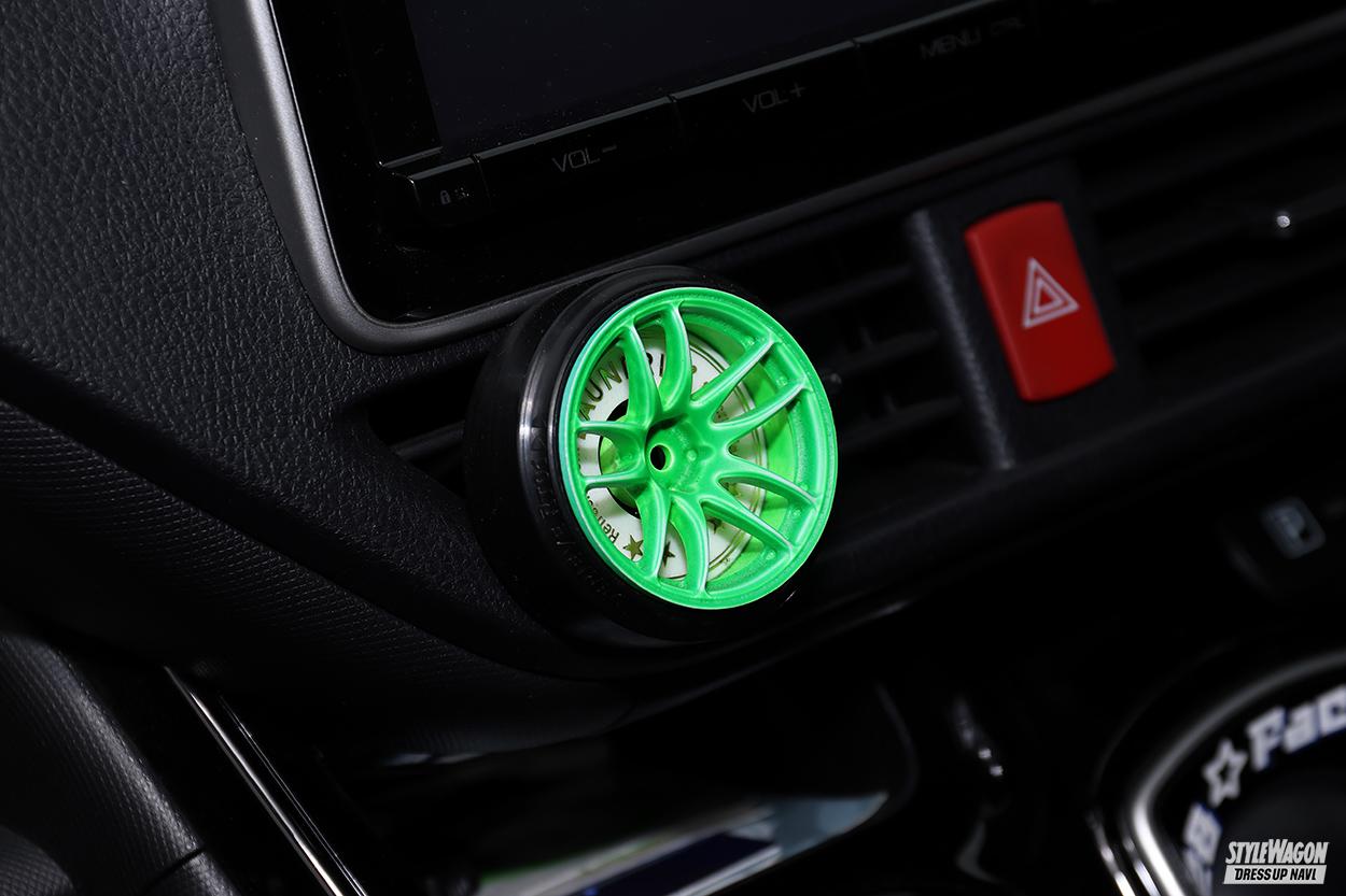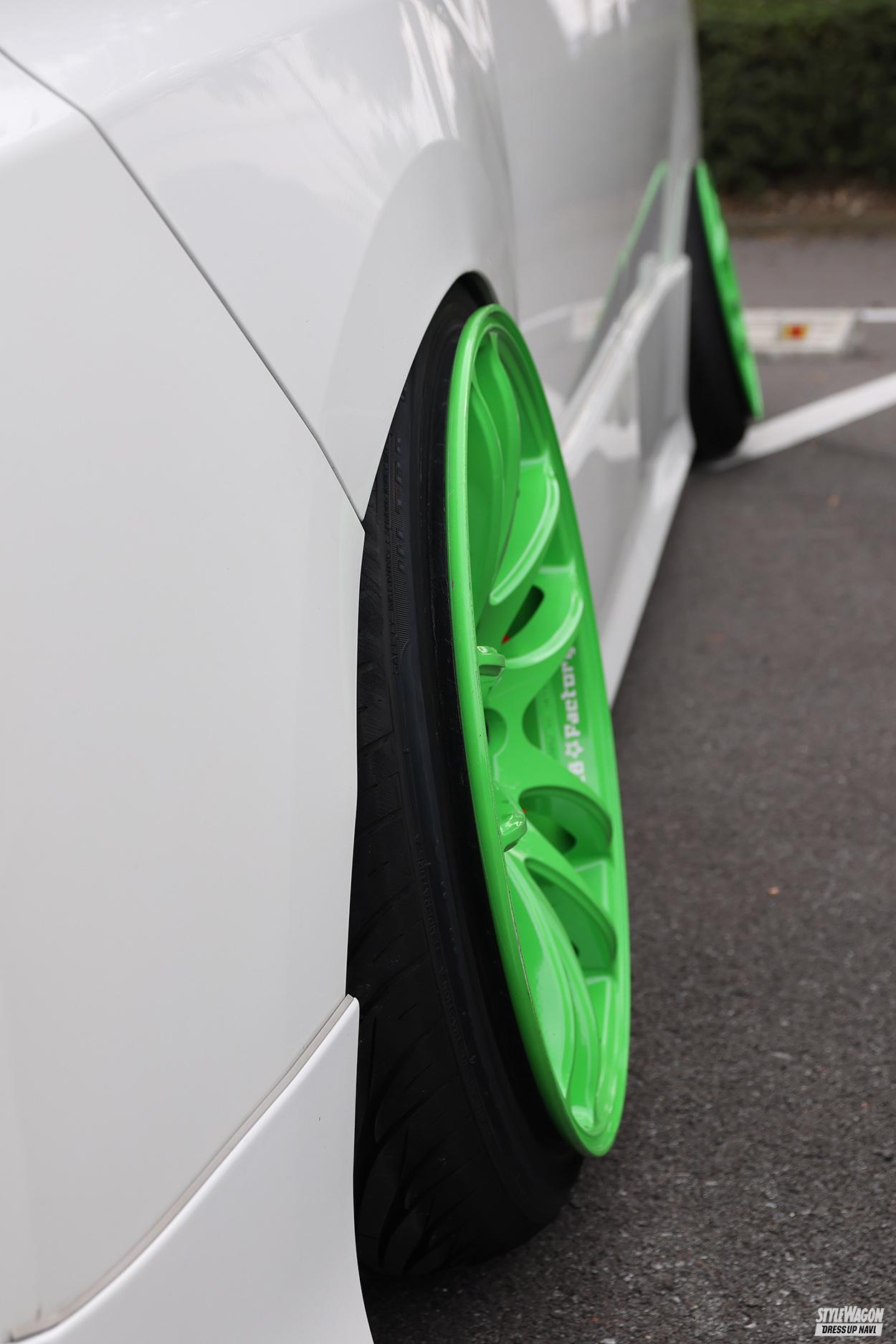 白いボディにライムグリーンのホイール色はナカナカ鮮烈! しかも車高は圧倒的に低く、しかもコダワリのアウトリップ仕様なのだ。「ホイール以外はほぼ純正」という、足まわり、とくにホイールに特化した1台なのである。実はこのホイール、3セット目なのだとか。白→赤→緑という変遷なので3色目というのが正確か。車内の芳香剤にはラジコンのホイールがセットされていたが、コレも当然ライムグリーン。今後はまたホイールを換装したいそうで……。仕上げはもちろんアウトリップだ。
