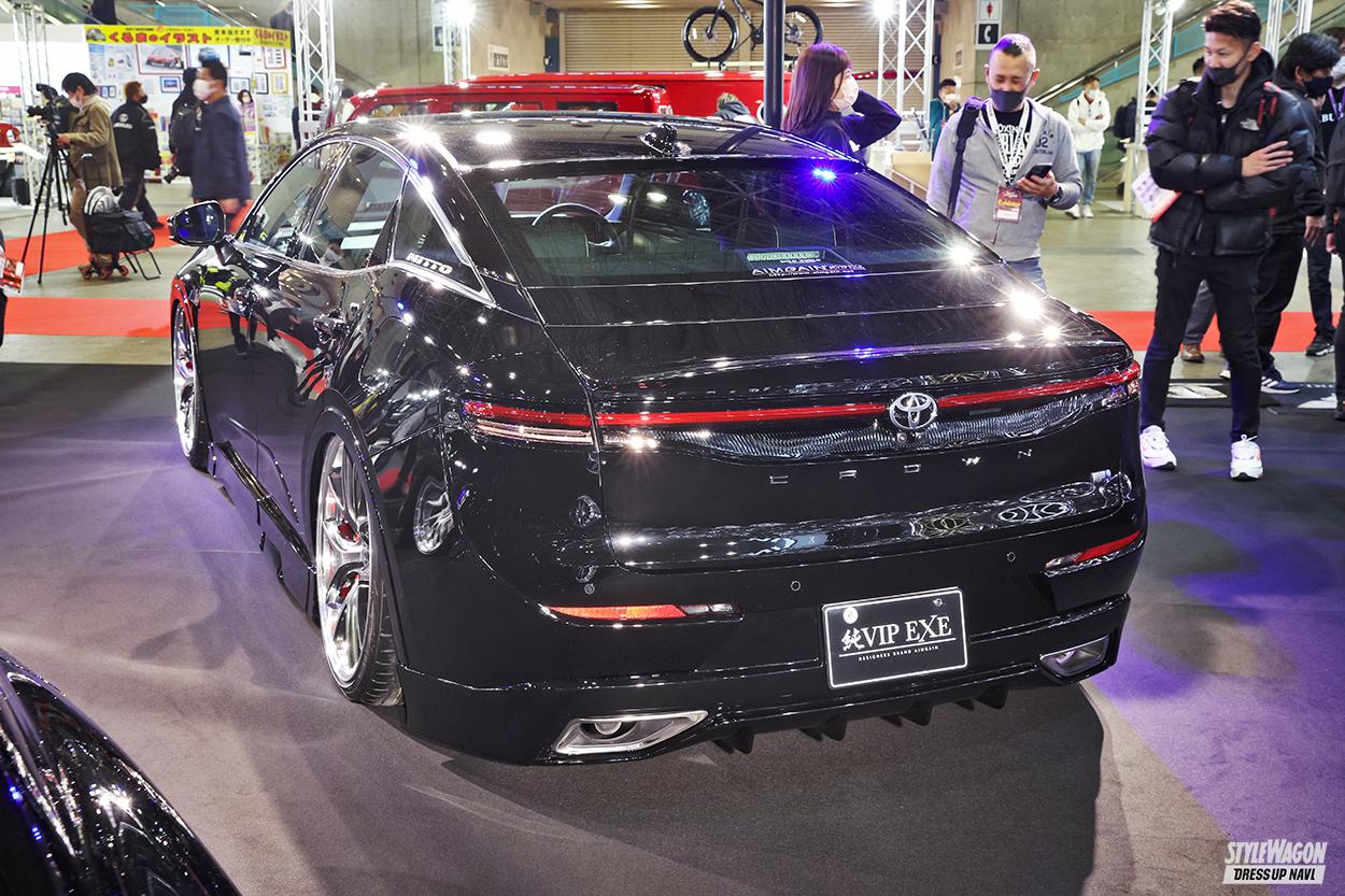 幅広いジャンルを手掛ける中でも、とりわけセダンカスタムの分野において屈指のノウハウと実績を持つエイムゲイン。その卓越した感性とクオリティはクロスオーバーモデルのクラウンにもいかんなく発揮。純VIPエグゼとして今回発表されたのはフロントリップ、サイド、リアハーフ+マフラーフィニッシャーなど6アイテム。メーカーイメージカラーのツートンではなく、精悍なブラック単色としたセンスも参考にしたいトコロ。