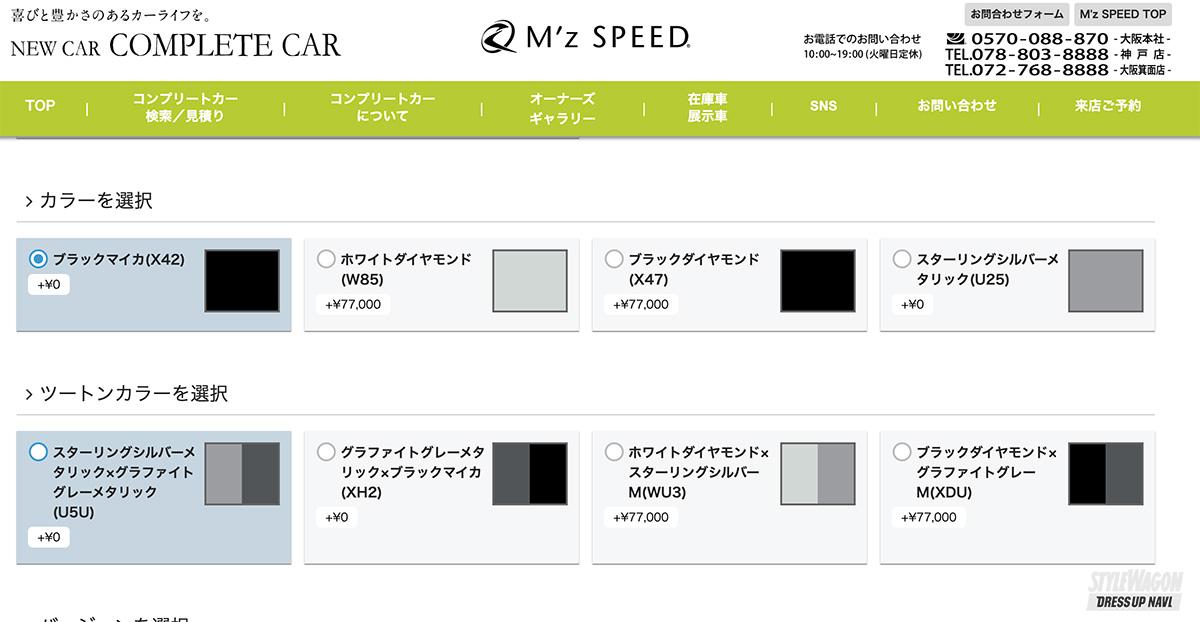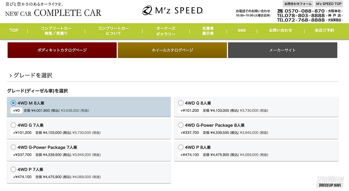 カスタムコンプリートカーを長く提案し続けているエムズスピード。店舗は全国の各主要都市にあるので直接じっくりと相談ができる。また、WEBで仕様や予算をシミュレーションできるシステムも、ポチポチするだけというわかりやすさで、手軽に家で予算などがわかるのもポイント。エムズオリジナルのカスタムアイテムはもちろん、メーカー&ディーラーオプション、ETCやドラレコなど細かい部分まで設定できるのもかなりリアルだ。最新エアロなどでカスタムしたプランは最小構成で約429万円と、車両価格から29万円プラスでカスタム仕様で納車される。かなりお買い得な設定だし、エムズスピードは新車購入が2.9%という低金利というのもメリット。新規購入、乗り換えの人はぜひ相談してみよう。