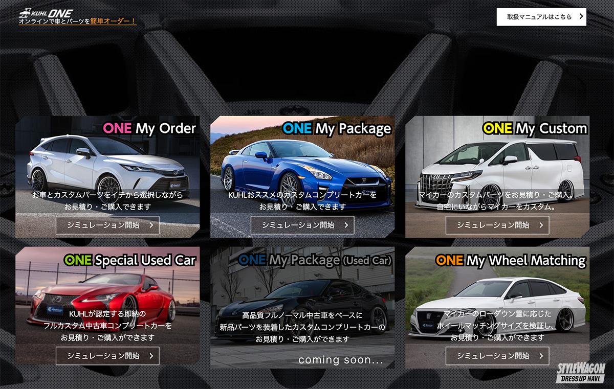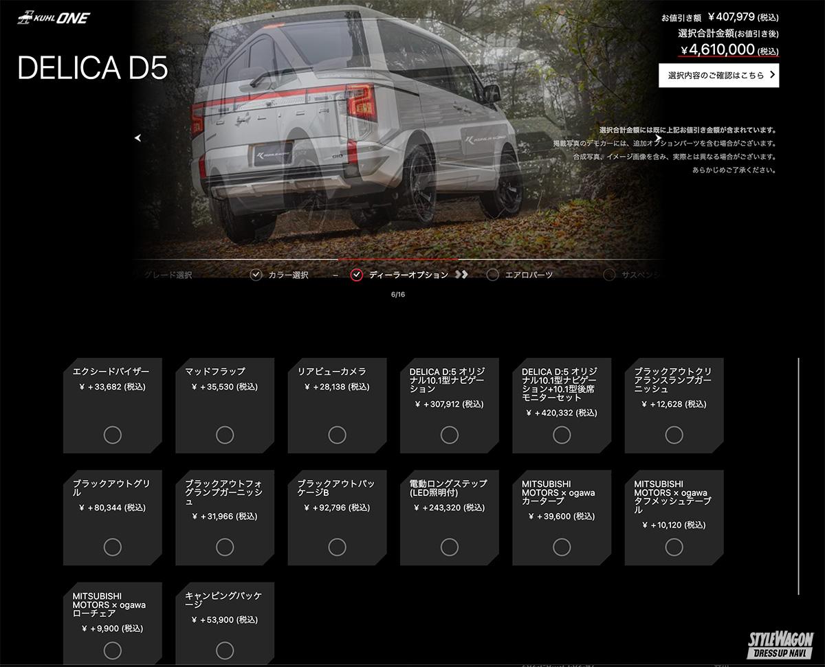 全国7店舗でカスタムコンプリートカー販売をお得な価格で展開しているクール。デリカD:5の基本プランはエアロ、ホイール&タイヤ、車高調、ナビ付きのパッケージで461万円。車両価格が約400万円なので+約60万円でクールの最新オフスポーツスタイルが手に入る。そして「クールワン」という画期的なシステムを展開中。これならお店に行かなくても諸費用まで含めて計算でき、条件によっては家でカスタム仕様をオーダーできて、家にクルマが届くという、アマゾン!?的な買い方ができるのだ。「通販でカスタムコンプリートカー」、すごい時代になってきたものです。また、納期が早めで、価格もさらに少しお得な中古ベース専門店「クールカーズ」もあるので、そちらも選択肢のひとつに。
