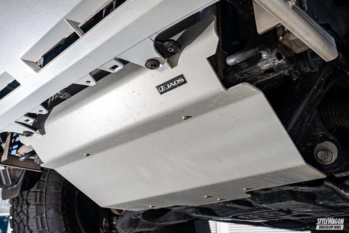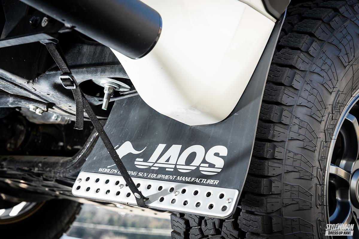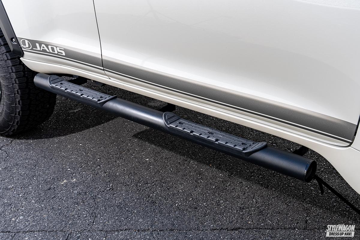 フロントまわりはステンレス素材で作られたロゴ入りプレート付きのスキッドバー、下まわりを保護するスキッドプレートでラギッド感を強調。また乗降性をサポートするサイドステップ、リアバンパーにアクセントを与えるリアスキッドバーもオフロードらしさを底上げしてくれる。ダミーボルトを添えたフェンダーガーニッシュタイプX、コンケイブを効かせた10本スポークのトライブクロスといったワイド感や足元の迫力アップを狙えるパーツも用意する。