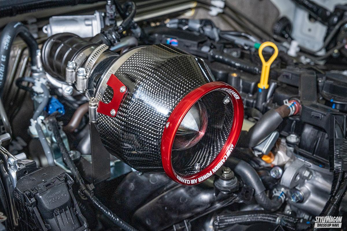 まずレスポンスアップへと導く吸排気系パーツ。エアクリーナーは、空気温度上昇を防ぐシールド付きタイプを筆頭に様々なモデルを設定。マフラーはリアビューにインパクトを与える、大口径114.3φ左右出しを用意。電子パーツもアクセルレスポンスを豊富なモードからセレクトして制御可能なスロコン、OBDⅡコネクタから車両情報を表示できるタッチブレインプラスなど豊富に設定。足まわりも同社の人気車高調「ダンパーZZ-R」を設定。しかもリフトアップとローダウンの2タイプを揃えるなど、幅広いニーズに対応している。
