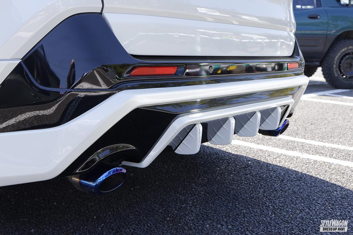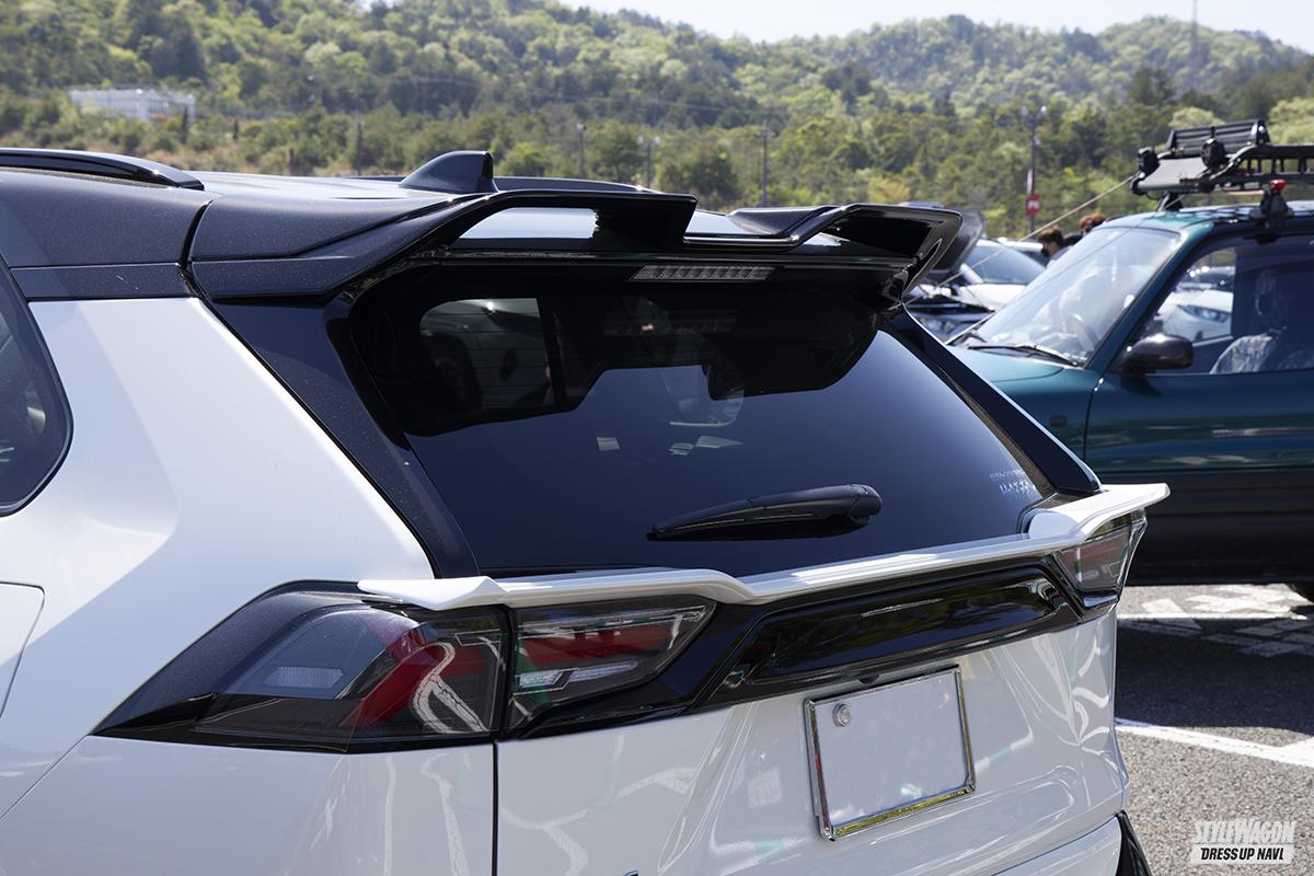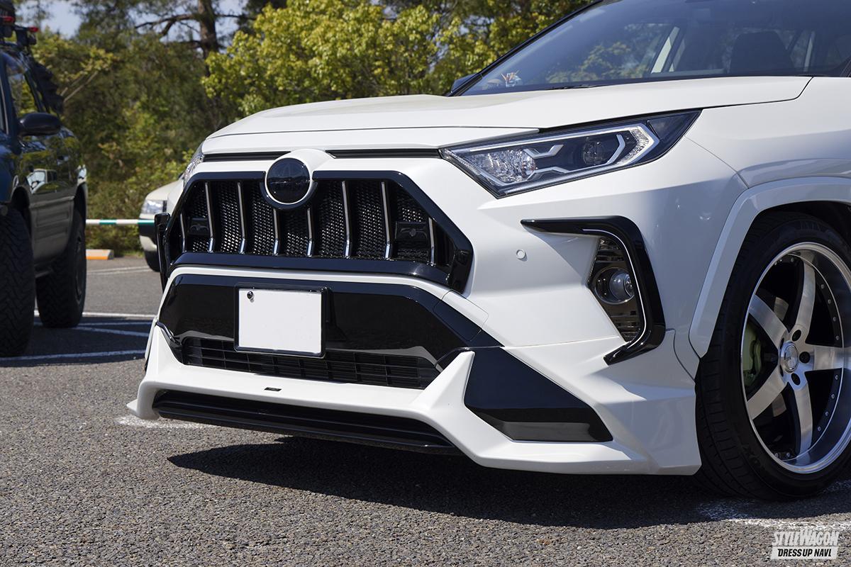 シンプルな王道5本スポークにディープリムが際立つロクサーニ・グラスターファイブをメインに据え、TRDとモデリスタをミックスしたエアロフォルム、エムズスピードの縦フィングリルなどでまとめたRAV4。ストリート感のある低いエアロスタイリングが疾走感を漂わせている。パーツは自ら見つけてきて板金屋さんに持ち込んで作業をしてもらうなど、コスト意識を高く持ちつつメイク。