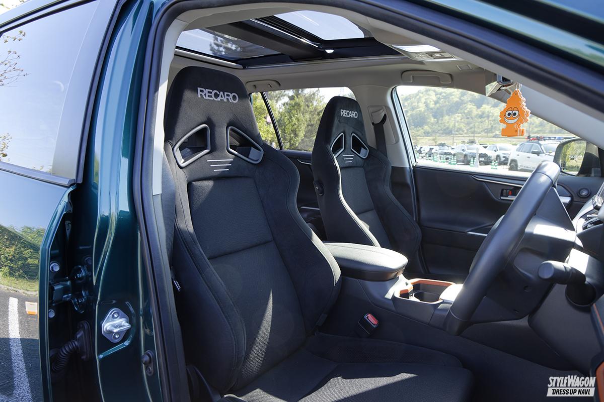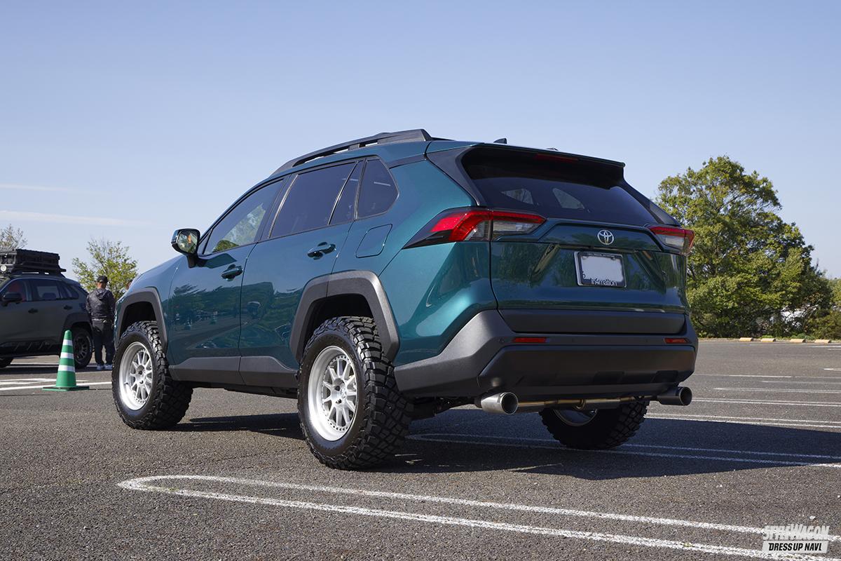 この綺麗な緑はE36BMWのボストングリーンメタリック。「シャコタン乗りがSUVに乗ったらこんな感じ」がコンセプトで、US純正のテールに、ルーフレール、ナンバーレスバンパー、サイドミラーのレンズ、サンバイザーとUS純正化を数々果たし、ワンオフのブレンボサイズに合わせて作ったホイールのバラマンディと、さりげなく見えるが、実は全身凝りに凝ったフルカスタム!