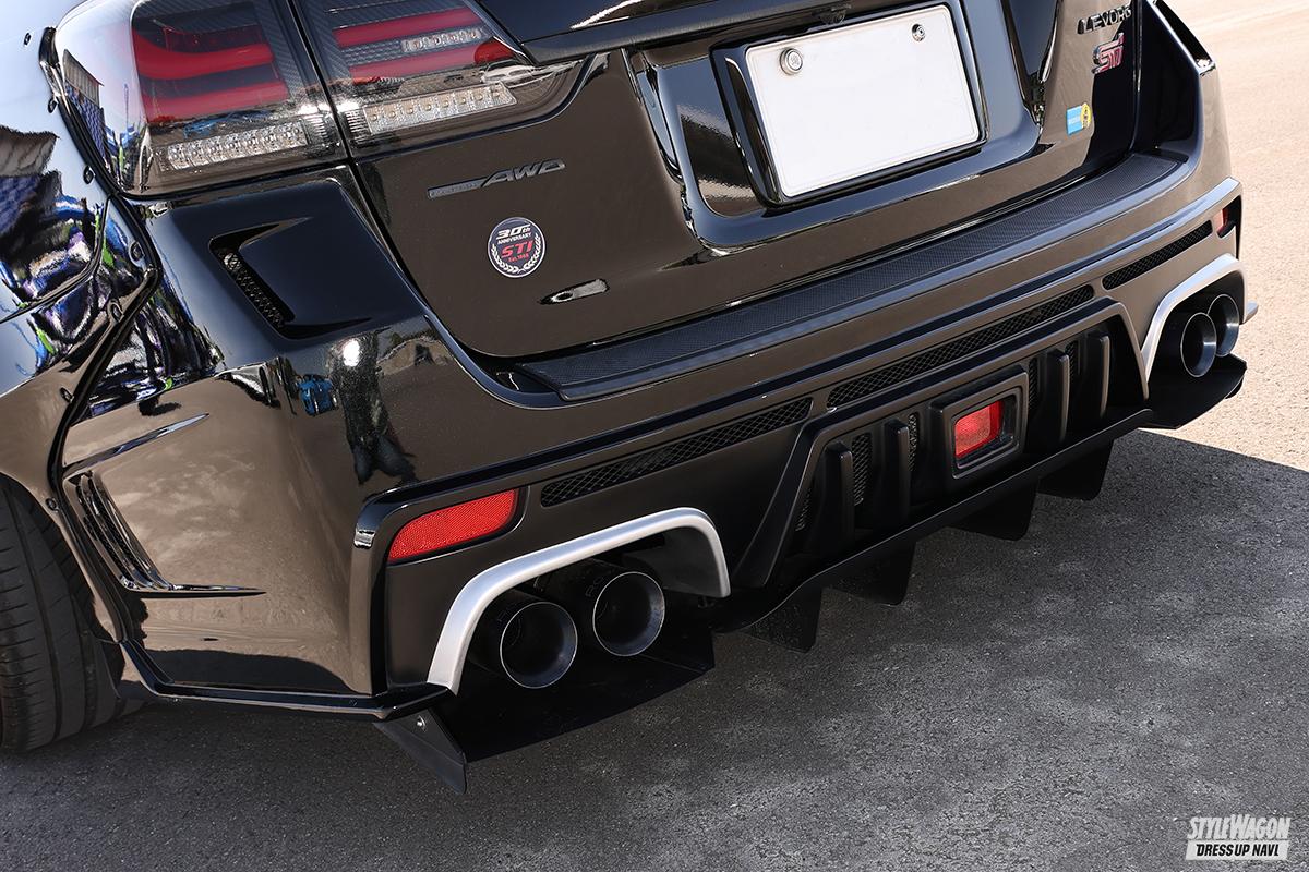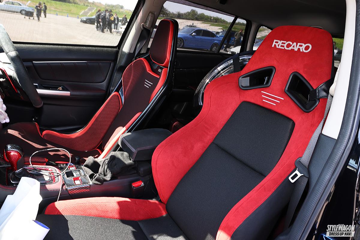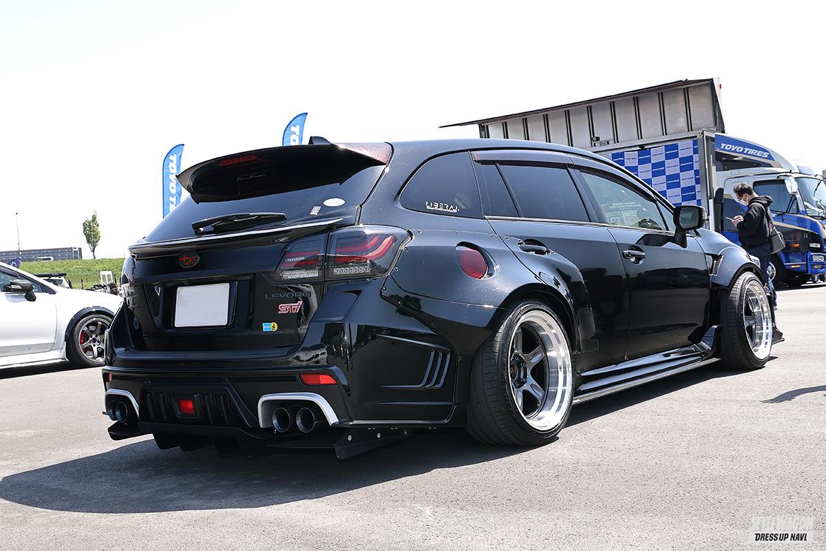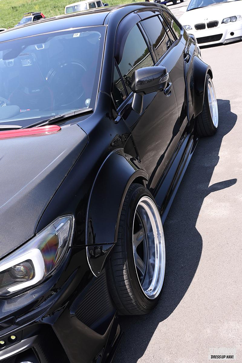 コラゾン製のインパクト抜群のワイドフェンダーをセットしたレヴォーグ。アディクションのフロントバンパーは両サイドの造形がレーシングカー然としていて、さらにブレーキも強化モノが採用されている! サーキットをがんがんと連想させるが、「通勤にも使う、どこでも行ける仕様」と言うから面白い。しかも外装パーツは、いわゆるミックスエアロ。それでココまでバランスさせるのだからセンスいいですねぇ〜。
