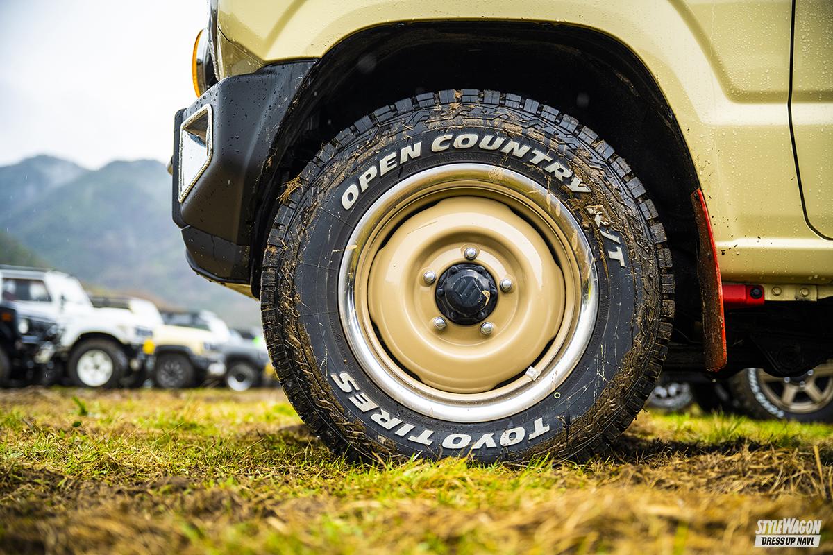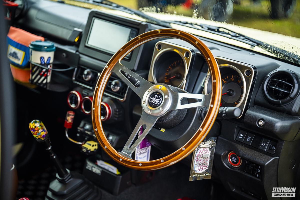 SPEC ●ホイール:TODYジムニー純正トリムリング(16×5.0J+20) ●タイヤ:トーヨー・オープンカントリーRT(185/85) ●インテリア:ステアリング=NRG、シートカバー、アウトクラスカーズ ●チューニング:マフラー:ロッソモデロ ●製作ショップ:ガレージM神河自動車