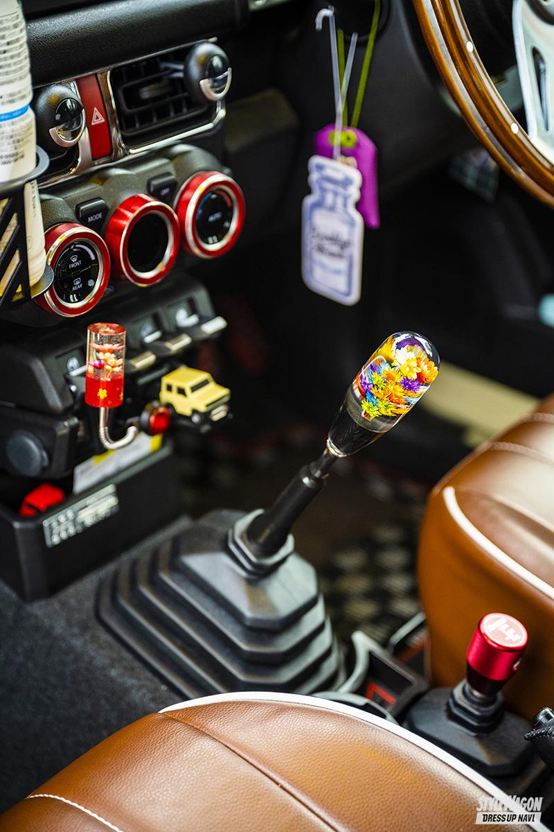 リフトアップなどガッツリいきたいところだが我慢しているという福井さん。内装、外装共にやり過ぎないを意識しているらしくまとまりある仕上がりになっている。ボディカラーは純正色のシフォンアイボリーメタリックだが天井の塗り分けやサイドデカールが上手く効果を発揮し懐かしさある雰囲気に。ホイールは鉄チンホイールをボディカラーに合わせトリムリングを装着。フォグは黄色の丸型を選択。車内も鋲打ちのウッドステアリングに水中花シフトノブと当時モノにこだわったパーツチョイスで車内外トータルで懐かしい感を出した。今後はホイールを変更するかも?とのこと。この雰囲気を崩さないでどんなホイールを選ぶのか興味深い。