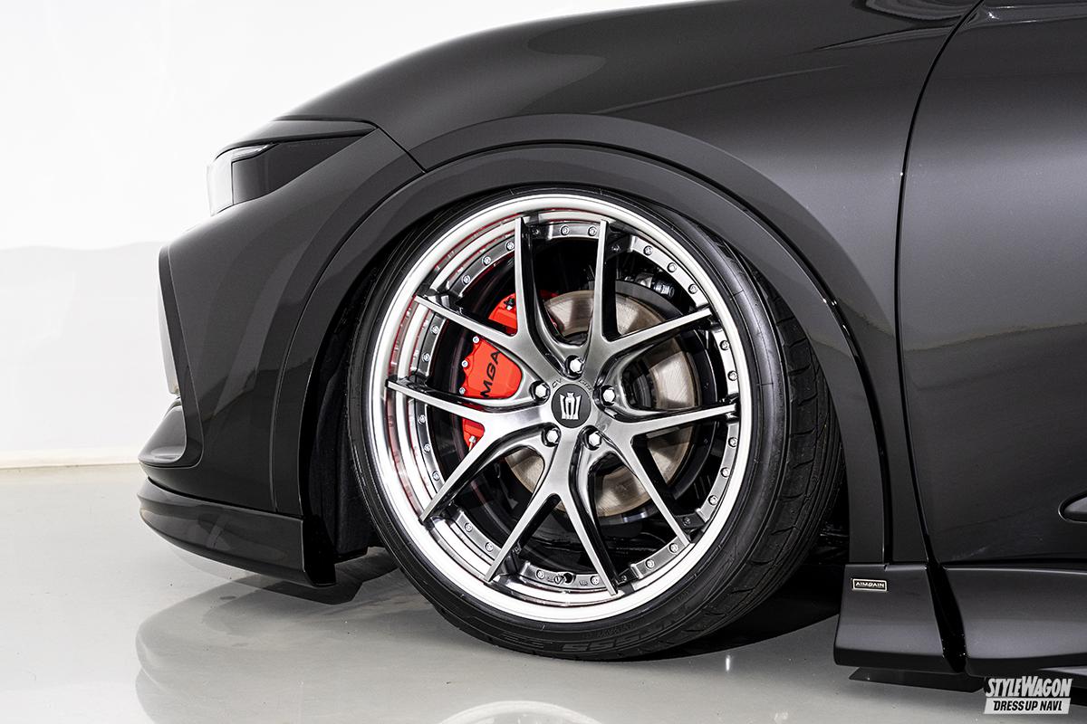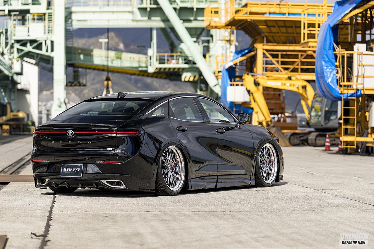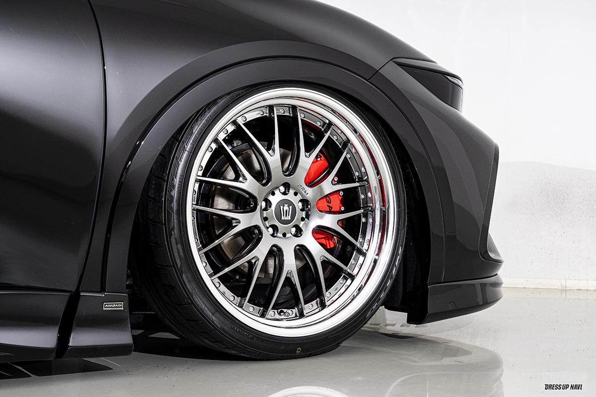 質の高い重厚感がみなぎる純VIPの中でも、特に大人っぽさと高級感とにこだわって造形されるEXEのボディキット。これをボルドワールドのエアサスでベタ落としにしたその姿は、あくまでもクラウンクロスオーバーが素材だが、まるでまだ見ぬクラウンセダンが再現されたかのよう。EXEでベタ落とせばセダン風のオーラが生まれる、これはクロスオーバー乗りにとっては覚えておくべきコーデ術だ。