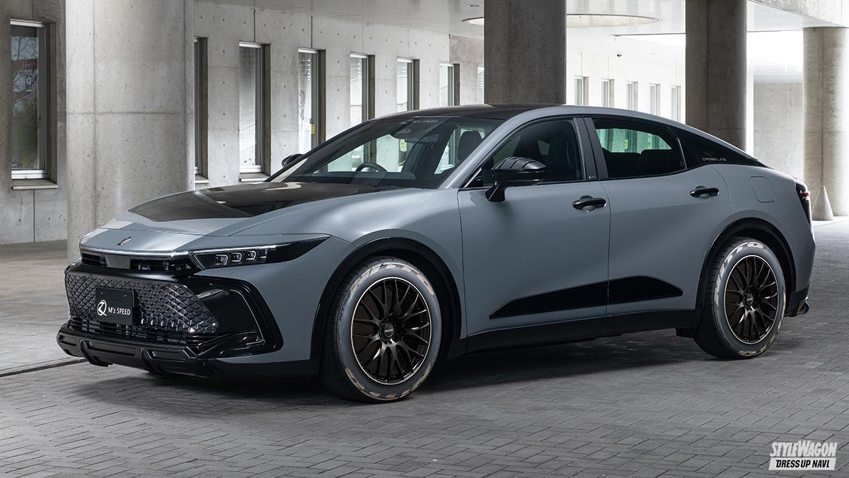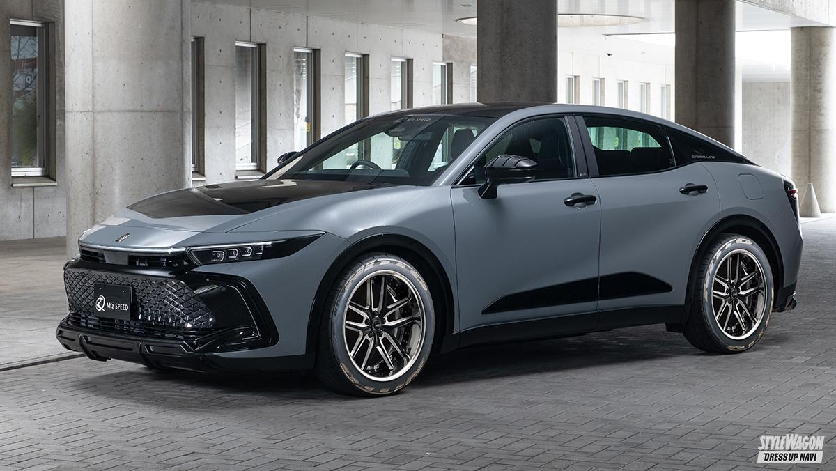 様々なホイールをVRマッチングしてみたのは、約3㎝ダウンしてエアロ&ボディカラーでカスタムされた、エムズスピードのクロスライン。前後スポイラーやフェンダーモールなどで、オフ感とスポーティさを両立したクラウンクロスオーバーだ。