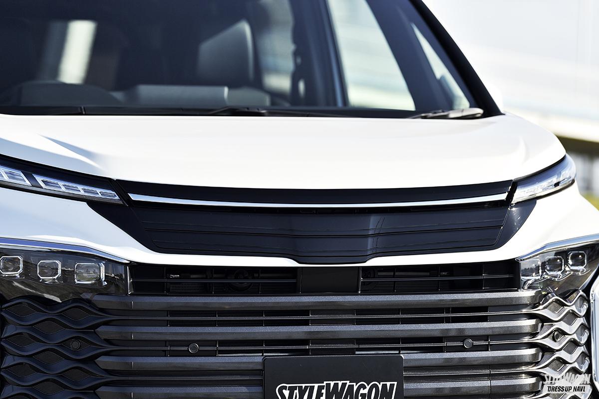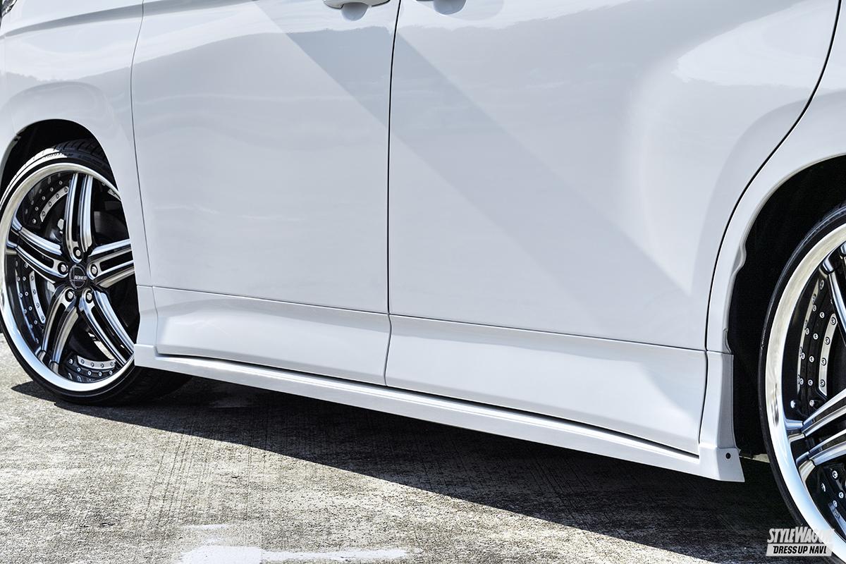 90系ヴォクシー最大のアイデンティティといえば、アグレッシブなデザインのフロントフェイス。中でも下半分を占める開口部は、他に類を見ないほど”攻めた”表情を作り出しているキモの部分。アドミレイションの純正エアログレード用スポイラー”デポルテ”は、そんな開口部をさらに引き立て、よりスポーティでエレガントに車両を変身させる。例えば、開口部左右のメッキラインをそのままスポイラーまで延ばし、リップ中央にもメッキバーを投入。これによりエアロのデザインと純正の造形との一体感が大きく高まり、自然に疾走感の向上に成功している。また、リアはフロントとバランスを取り派手めのハーフスポイラーとしつつ、サイドはあえてシンプルに仕上げているのもポイント。見るべきポイントをしっかりと作ったメリハリのある構成が、一味違うヴォクシーを演出する。