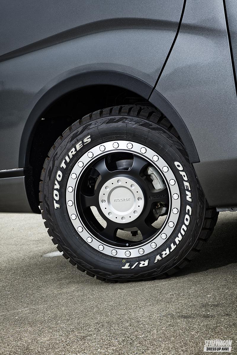 ビジュアルの鍵となるのはフロントのバンパーガード。しっかりと立体感を持たせつつ、ビス留めルックとしたその装いはスパルタンで、まるでUSピックアップトラックのような迫力と威圧感を演出してくれる。無骨でUSテイストが強いオリジナルホイール、エセックス・タイプEUとの相乗効果で、本場の薫りが漂う仕立てだ。