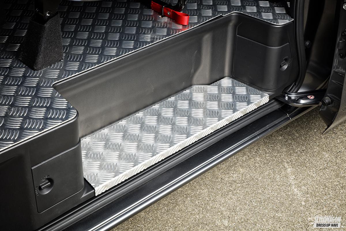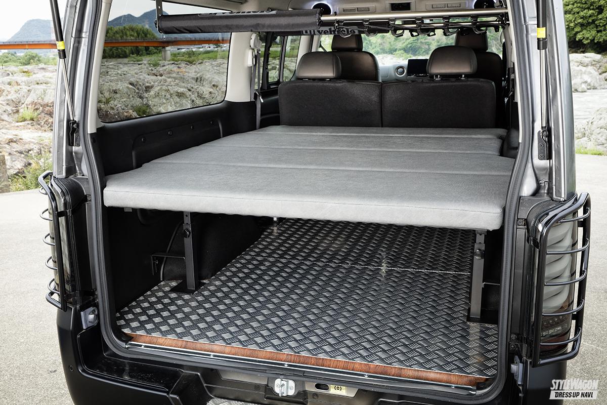 室内に設置されたベッドキットは、キャンプなどの際に車外でベンチとしても使用できるなど、ユーティリティ性も優秀。もちろん車中泊時にも快適で、外遊び仕様には不可欠だ。新作のアルミフロアパネルや、ワンオフとなる荷室の縞板アルミフロアなどは、アウトドアでのタフな仕様にもぴったり。移動も車中泊も存分に満喫可。
