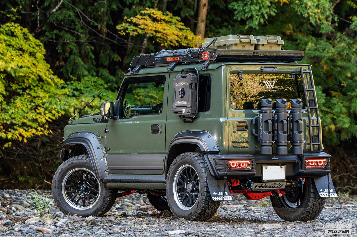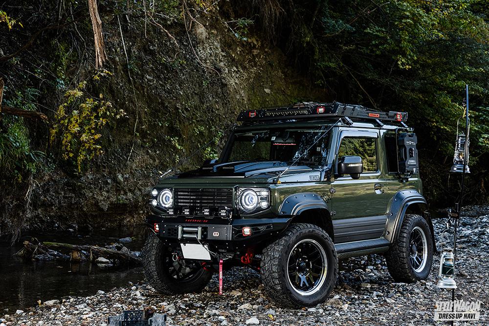 二人とも乗っているクルマはジムニー。NaokiさんのJB74は、かなりいかつい。ジャングルグリーンのボディ色に、ハイブリッジファーストの3インチアップ。RAYSの18インチホイールを履かせて、HAMERのフロントバンパーに、WALDのリアバンパー、オーバーフェンダー。ルーフラックを装着し、キャンプの利便性を向上させつつ、迫力十分。購入のきっかけは、たまたま本で見たJB74のアイアンマンとブラックバイソンの2台を見て一目惚れしてしまったこと。この二つの良いとこ取りをしてみたくなり、車両を購入。そこから様々なアイテムを吟味しつつ、カスタマイズ。かなり迫力あるルックスを手に入れた。誰とも被らない、Naokiさんのセンスで作り上げられた、オリジナルのスタイルだ。