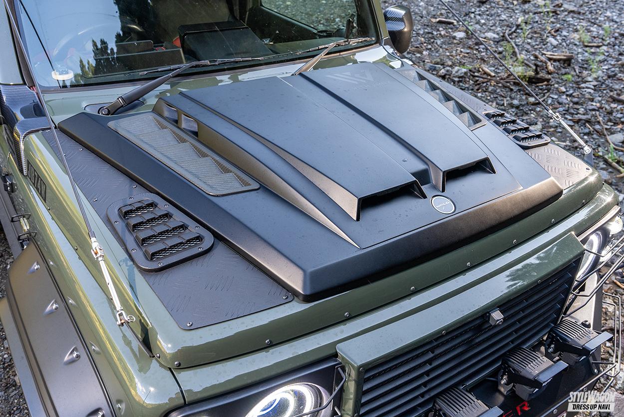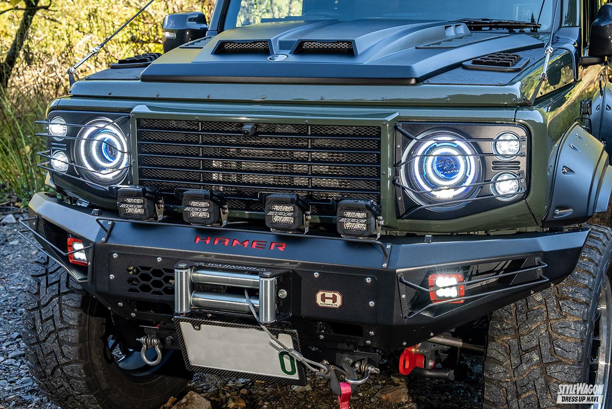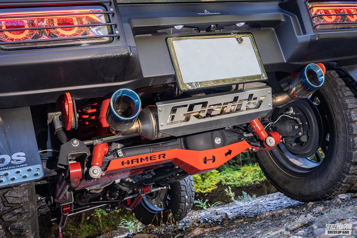●EXTERIOR:HAMER4×4フロントバンパー&ルーフラック、WALDリアバンパー&オーバーフェンダー&ボンンネットスクープカバー、DAMDリトルDグリル&自作ライトガード、べバストサンルーフ、ショウワガレージリアラダー、WARNパワースポーツXON45ウインチ、クリスタルアイバルカンファイバーLEDテール、IPF製LEDワークランプ×4、APIO牽引フック×4&サイドラック、PLTOロトパックス×2&ロールパックス×2、PROSTAFF電動サイドステップ、ワンオフヘッドライト(純正加工)、JAOSマッドガード