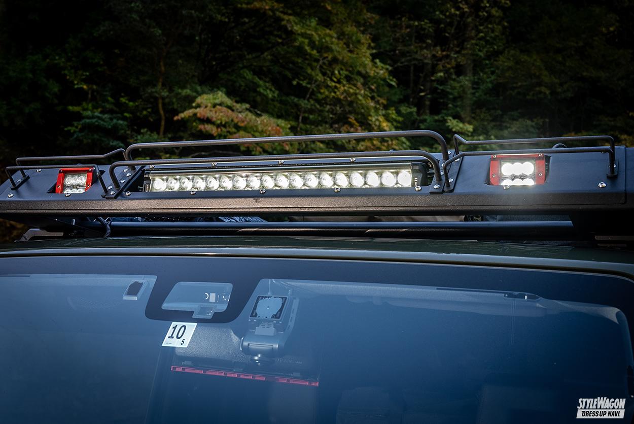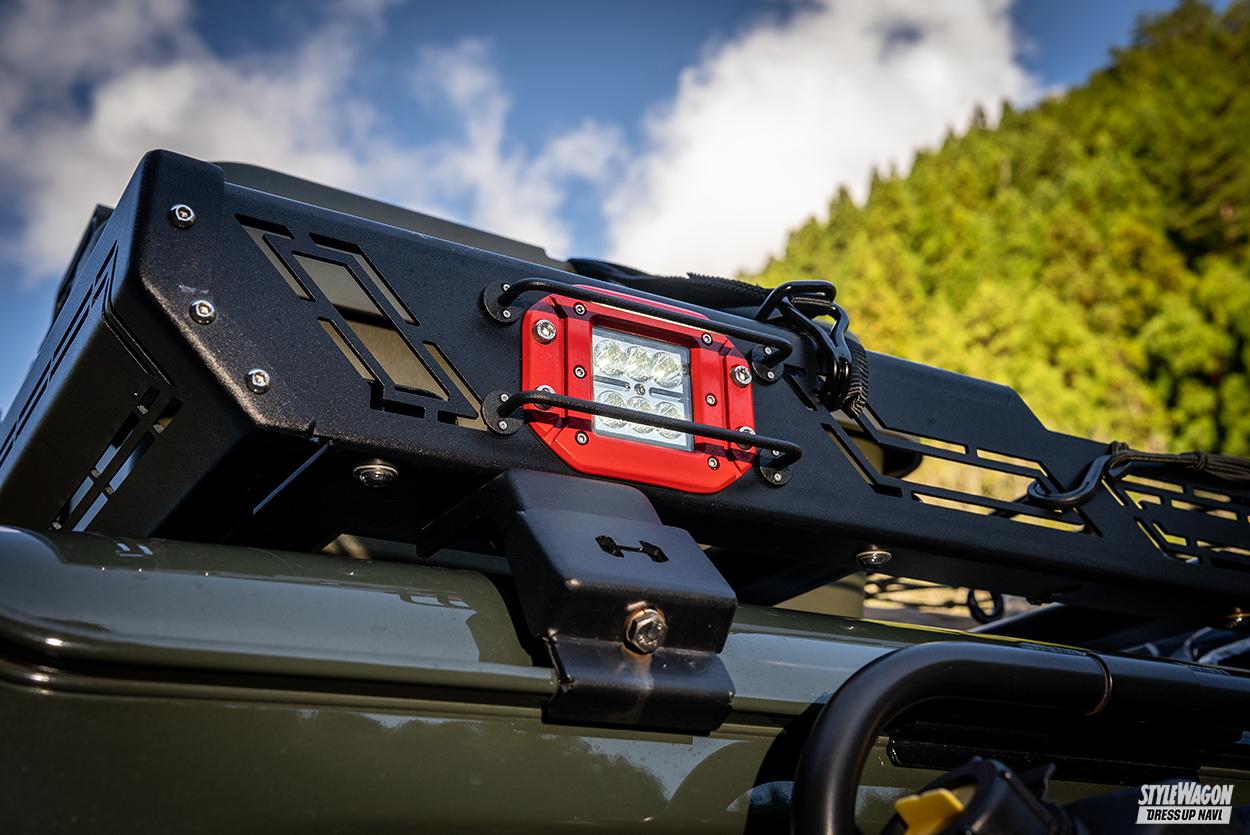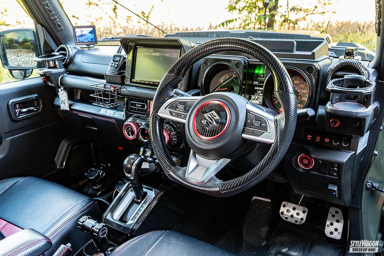 アイアンマンとブラックバイソンという、JB74系のコンプリートキットの良いとこ取りを行なったというNaokiさんのJB74。ロトパックスをサイドマウントし、ロールパックスをブラックに塗装し、背面に3連装。HAMERのフロントバンパーには、ウインチを搭載。ルーフラックには全方位点灯可能なようにLEDランプを装着。驚くべき装備はルーフを加工し、サンルーフの取り付けを行なっている。ルーフラックのフロアパネルも加工して、取り付けを行なったサンルーフ。ルーフラックからボンネット先端にブッシュワイヤーを装備し、藪漕ぎでボディを守れるようにし、ルックスと実際の使用用途に合わせてカスタムを行なっている。サイドステップは、ドアの開閉に合わせて自動昇降する。ボディカラーのジャングルグリーンもあり、かなりミリタリーテイストが強い。もともと、野宿にハマる前からルックスに一目惚れし、作り込んできていたJB74は、アウトドアに最適。今では、野宿を行う最高のパートナーとなっている。