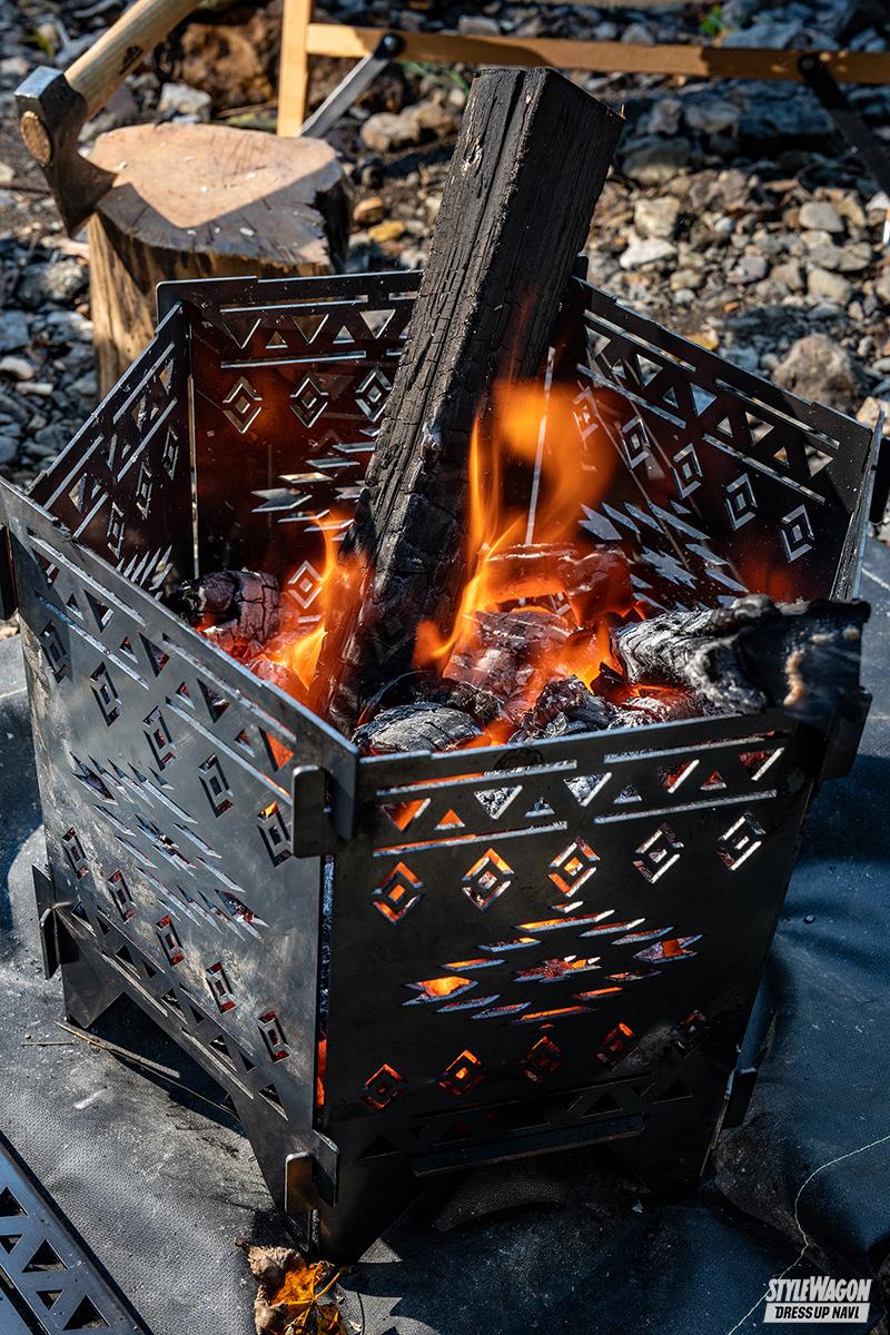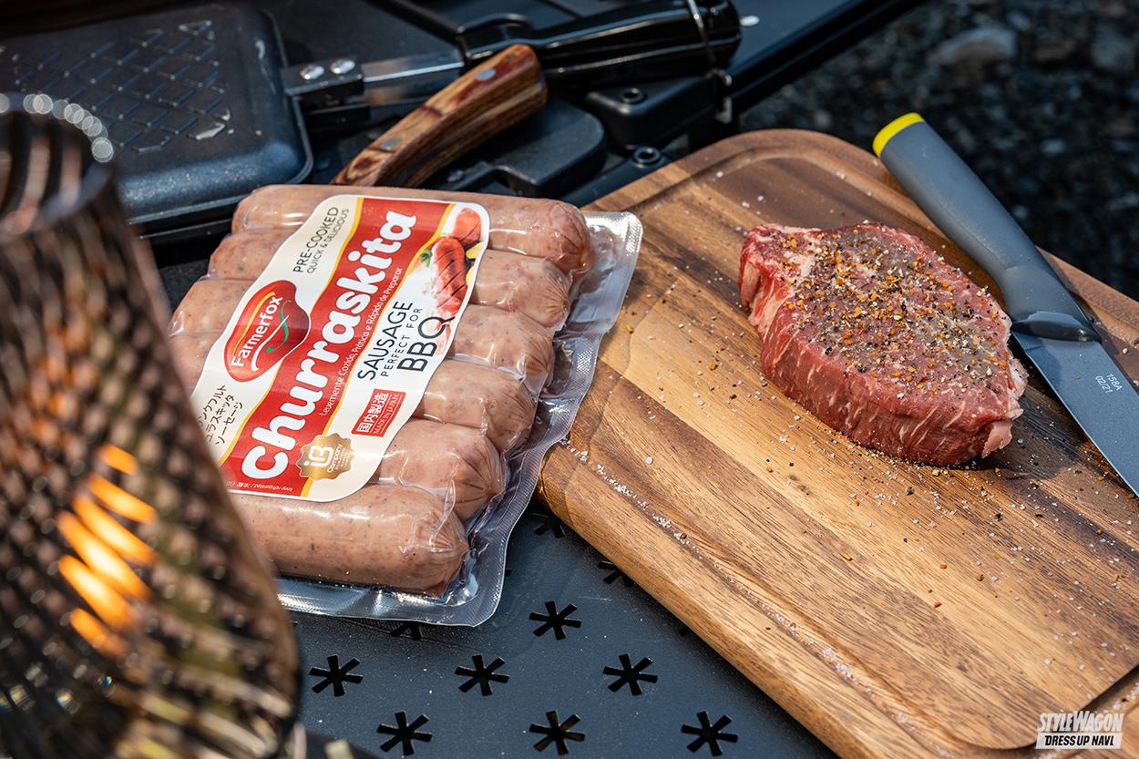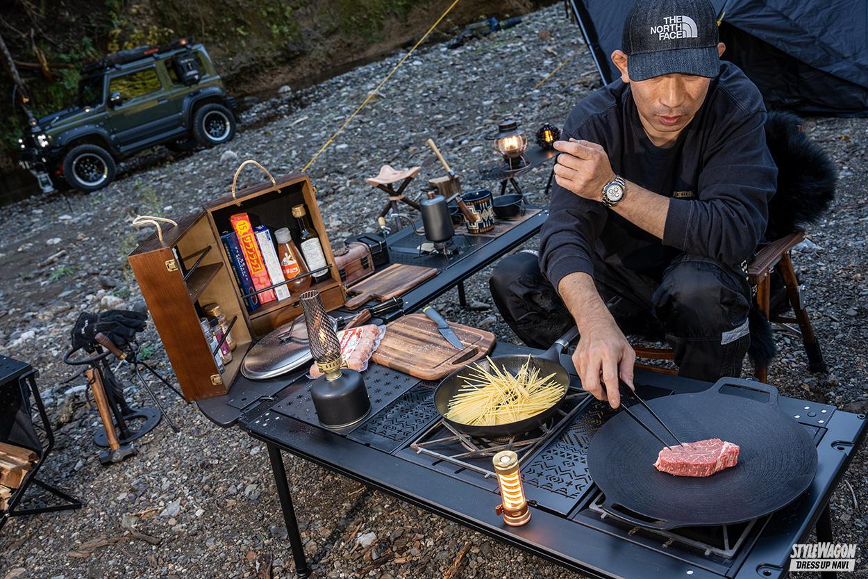 キャンプギアに関してのこだわりも強く、テント、椅子、テーブルなど全てのギアはブラック。一つ一つのアイテムが実用を最優先で考慮しているにも関わらず、オシャレ。さらにここでNaokiさん、驚きのプロフィールが発覚。実は元シェフということで焚き火をし、くつろいでいる時に、「いろいろ料理の準備をしているので、食べていってください!」とのこと。手際を見ていると、どう考えても素人ではない。出てきた料理も一手間かけたもので、かなり旨い! ただステーキを焼くだけでも、表面を焼いた後に、アルミホイールで予熱調理したり、愛用している調味料などもそこらのキャンパーとはちょっと違う。師匠のタケさんも「料理に関しては、Naokiさんはピカイチだよ!」と太鼓判。 野宿というと、全てが質素になりがち。しかし、Naokiさんとタケさんが行う野宿スタイルは、何もない山奥で、最低限シンプルな装備。しかし、酒と酒のつまみは超一流。気心知れた仲間との会話に、抜群の景色。このスタイルはある意味凄く贅沢。見ている筆者も憧れてしまう。