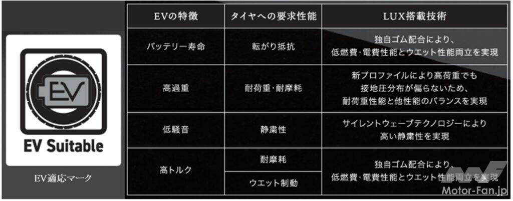 さらに、EVタイヤに求められる転がり抵抗性能・耐荷重性能・静粛性能・耐摩耗性能・ウエットグリップ性能を高いレベルで満たしたタイヤとして、タイヤ側面に「EV適応マーク」を刻印している。