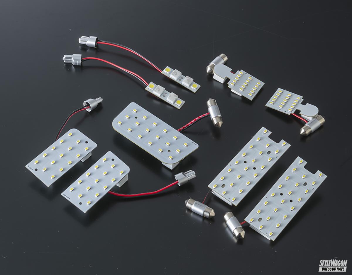 後期型クリーンディーゼル車専用となるデリカD:5用のジュエルルームランプセットも新登場。マップランプに30発、セカンドルームランプに46発、サードルームランプに18発、ラゲッジランプに30発と大量のLEDを投入できるセットで、明るく品質が安定したSMDタイプLEDを採用しているから室内の環境はガラリ一変。無極性と取り付けやすいのも魅力で、定電圧制御回路も内蔵。キットには4LEDのライセンスランプも含まれている。
