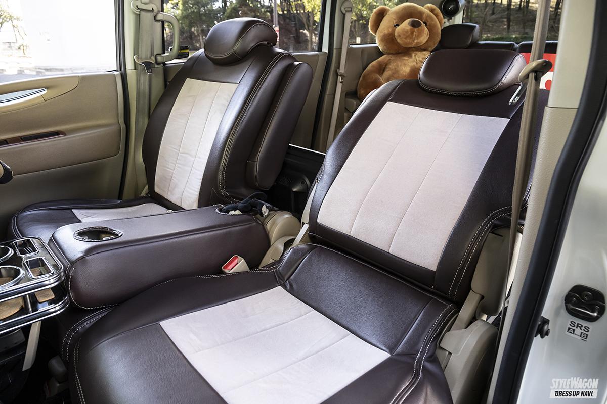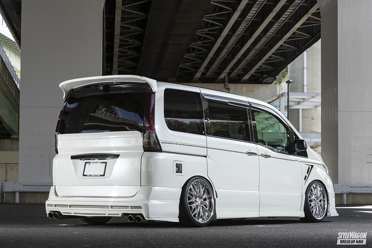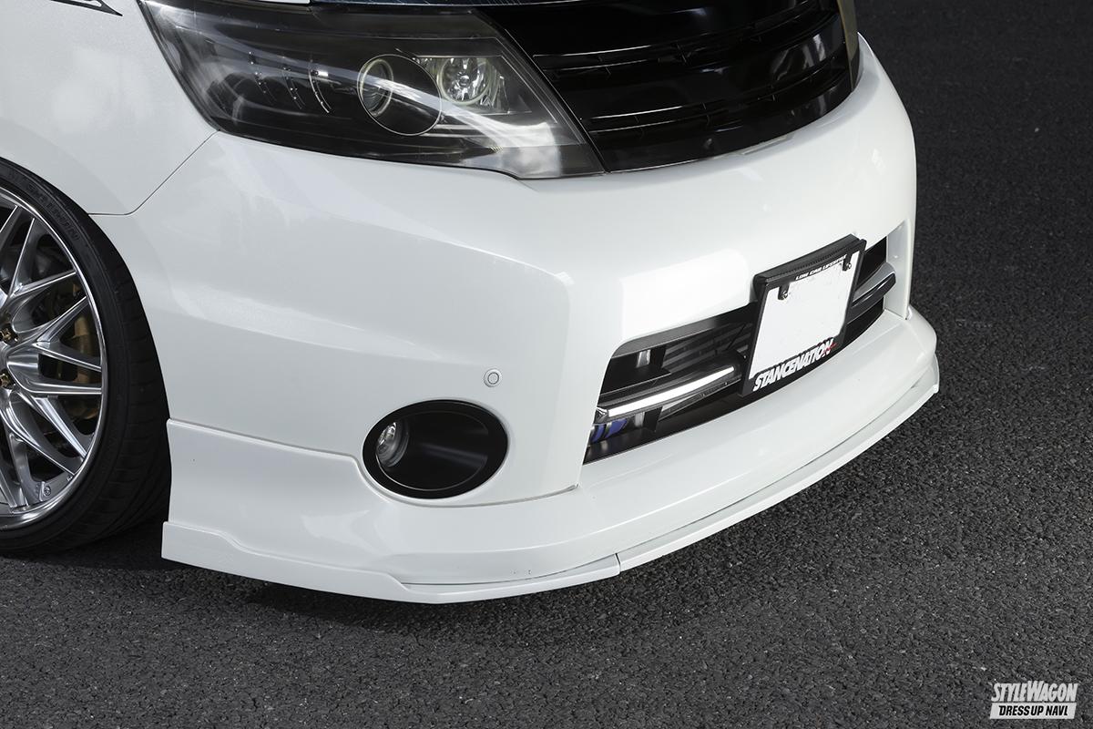 ミニカーからグッズ、補修パーツまで、家の中はセレナ関係のモノで溢れているというたかけんさん。2005年に3代目セレナC25が出た時から、そのスタイルに惚れて、以来ずっとC25ひと筋で3台を乗り継いできた生粋のC25フリーク。今の愛車は知人から譲ってもらったモノで、2台目に付けていたパーツを移植し、前期標準グレード5ナンバー仕様から、後期ハイウェイスター3ナンバー仕様にカスタム。フロントまわりはフル後期仕様となっている。ポイントはルーフからボンネットまでをブラックにしたカラーリングと、低いフォルム、ダミーインタークーラーなどによるスポーティな仕上がりだ。