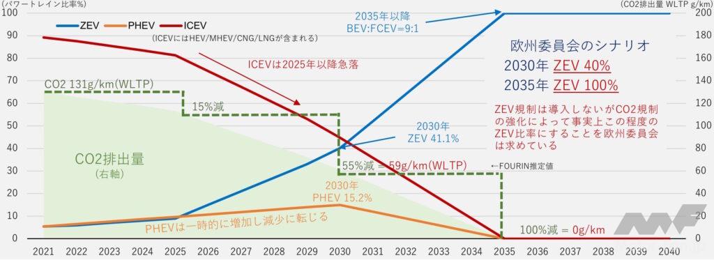 欧州では、COP26より先7月に欧州委員会(欧州の内閣に相当)が、2030年の温室効果ガス削減目標を1990年比で少なくとも55%削減を達成するための政策パッケージ“Fit for 55”を発表した。欧州全体でCO2排出量を55%削減する政策まとめたものだが、乗用車については新車の平均排出量を2030年に2021年(95g/km)比 55%削減(59g/kWh)、2035年に100%削減(0g/kM)を目標に設定している。以上の欧州委員会のシナリオをグラフ化したものが下図である。実質的にHEVを含むエンジン搭載車の販売禁止である。