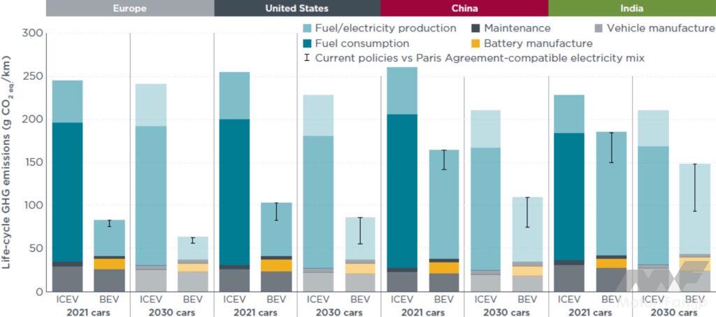 欧州委員会のEV一辺倒の主張の裏付けとなっているのが国際クリーン交通委員会(ICCT)の一連の報告だ。ICCTはVWのディーゼル不正を暴いた環境シンクタンクである。欧州委員会の“FIT for 55“に合わせてICCTから「BEVは世界中どこでもHEVよりLCA評価によるCO2排出量が少ない」というBEVを賞賛する報告書Aと、「e-FuelはBEVと比べて総合効率が大きく劣るので、検討するのは時間の無駄だ」というe-Fuelを否定する報告書Bが発行されている。合わせて、「マージナル電源(第2章で詳述)」の概念を真っ向から否定するネット記事Cを英国の研究者が発表している。 報告書Aでは、EU、USA、中国、インドの電力事情に応じて、2021年と2030年に登録されるBEVのLCA評価によるCO2排出量が算出されている。バッテリーの製造に伴うCO2排出量と発電所からのCO2排出量が算出されているのは一歩前進だが、HEVを頑張っても無駄だと言わんばかりに、一般的に報告されているCO2排出量より大幅に小さな値が示されている。この理由については第2章で解説する。