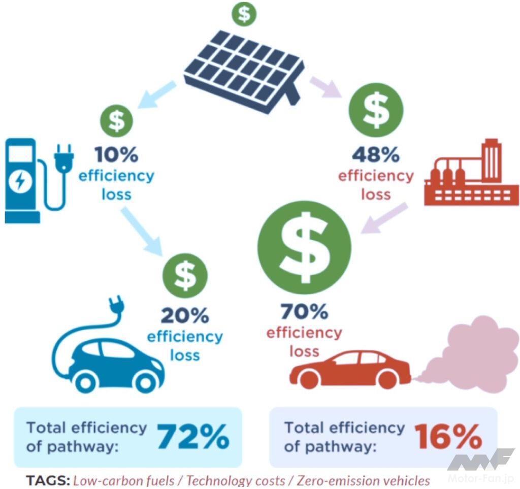 一方、報告書Bでは、再エネ発電からクルマのタイヤまでのエネルギー効率を予測している。報告書Aでは、2030年までにe-Fuelは普及しないという仮定をおいているので、それを裏付ける資料という位置付けである。この考え方については、第3章で解説する。