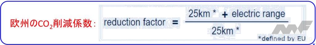 VWのディーゼルゲートとは別に、EM規制強化に伴うディーゼルエンジンのコスト上昇の懸念から、欧州ではPHEV(プラグインハイブリッド車)によるCO2規制対応ができるような仕組みが導入された。これは充電による走行はBEVと同様にCO2排出量をゼロカウントして、充電走行距離に応じて、次のようなCO2排出量の削減係数をハイブリッド走行燃費にかけ算して、そのクルマのCO2排出量とする計算方法だ。