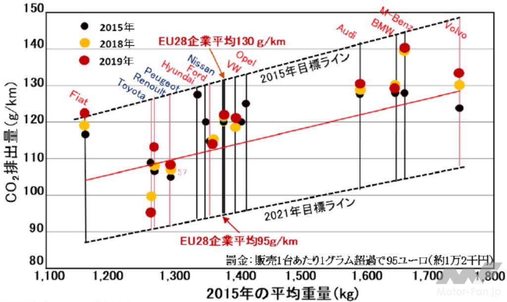 欧州2021年CO2規制強化に向けた各メーカーの対応状況(提供:愛知工業大学・藤村俊夫氏)