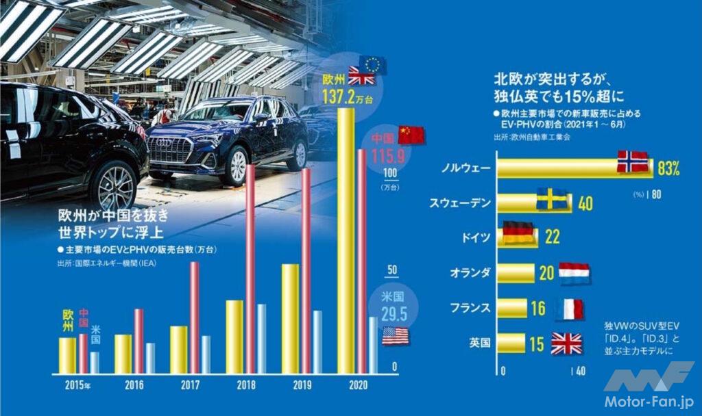 実際にBEVとPHEVの販売は欧州で急増している。図に示すように2020年には140万台に迫り、中でも北欧が突出しているが、独仏英でもシェアが15%を超えた。現在の販売は補助金に支えられていると言ってもいい状態なので、長い目で見ると、補助金なしで独り立ちできるようになって初めて本物である。