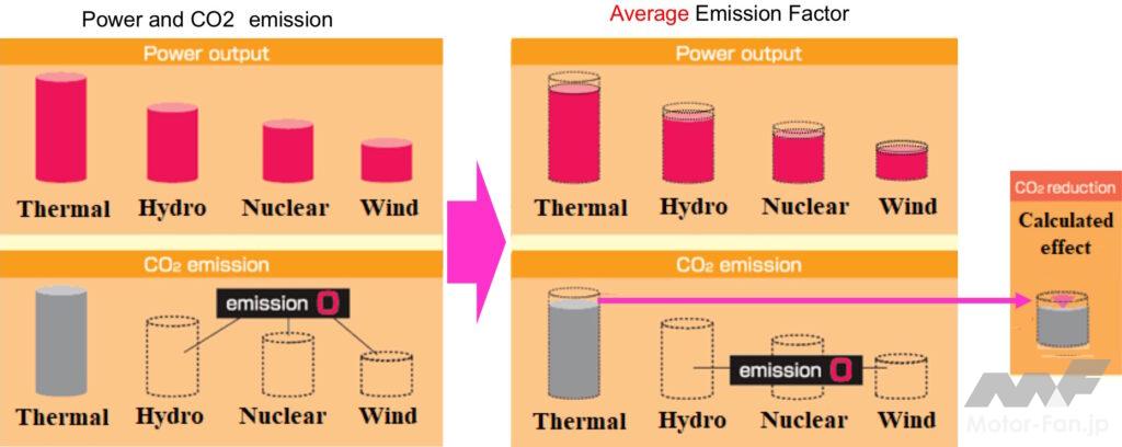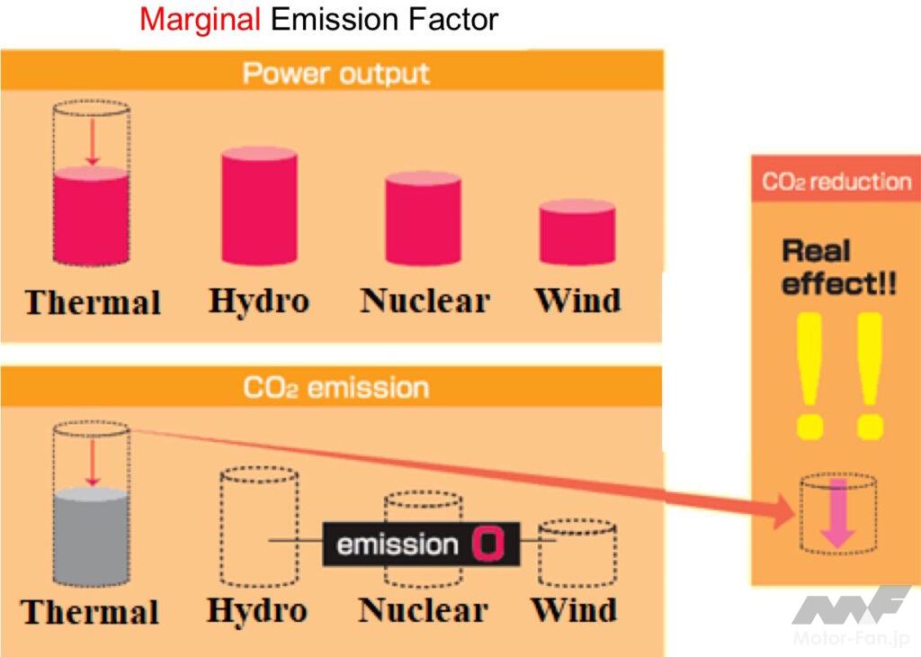 実際は、運転コストが高い火力発電が発電量を減少するので、図に示すように、火力発電のCO2排出量が減少する。運転コストが小さい水力、原子力、風力は需要が減少しても発電量を減少することはない。その結果、実際のCO2排出量の減少量は火力発電(マージナル電源)の排出係数を使って算出した値になり、電源平均で算出した値より大幅に大きくなる。ここでは火力発電の中でどの発電形態がマージナル電源になるかは、条件によって大きく代わるので、言及しない。