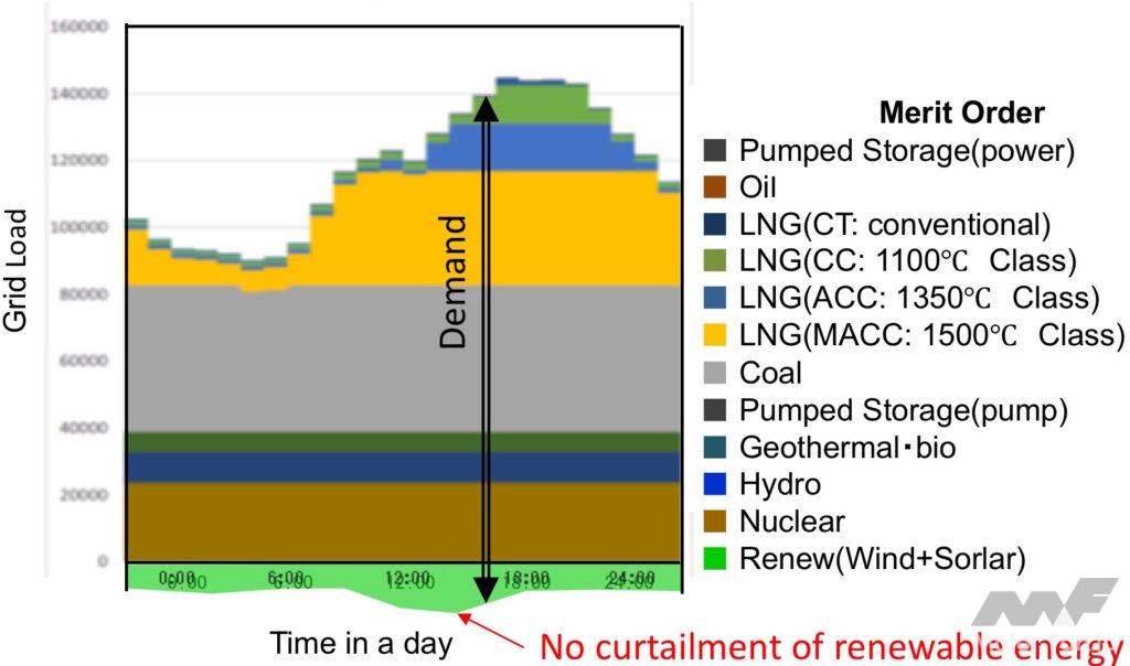 すなわち、電力需要が増減する場合に、火力発電、原子力発電、水力や再エネ発電など全ての電源が同じ比率で発電量を増減させるという想定になる。経済合理性から、すべての電源の発電量を同率で増減させることは考えられないので、これは明らかに実態とは異なる。