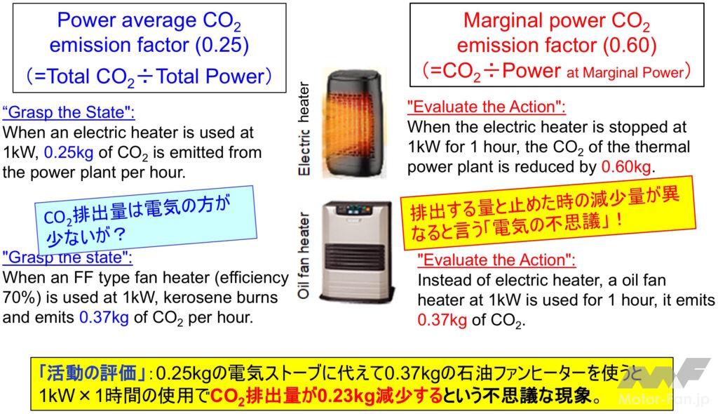 下図に示すように、それぞれのヒーターを1kWで1時間使う場合のCO2排出量はそれぞれ0.25kgと0.37kgで、電気の方が少ない。一方、電気ヒーターを1時間止めた場合は、火力発電が発電量を減少するのでCO2排出量の減少量は0.60kgになる。これは、電気ヒーターを止めて代わりに石油ファンヒーターを使うという活動で、1時間当たり0.23kgのCO2排出量が減少することを意味している。「状態の把握」の0.25kgと「活動の評価」の0.60kgはともに正しい値であるが、電気ヒーターが排出している量と止めた場合に減少する量が異なるという「電気の不思議」としか言えない現象が起こる。
