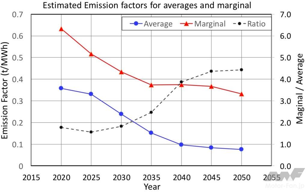 そのため、「状態の把握」と「活動の評価」によってCO2排出係数を使い分けることがCO2排出量を適切に評価するためには必須である。つまり、省エネなどで電力消費が減少した場合のCO2排出量減少効果の算出や、BEVとHEVほかのパワートレインを普及させる場合のCO2排出量の比較のような政策の評価には、電源平均ではなく、マージナル電源の排出係数を使う必要があることを示している。